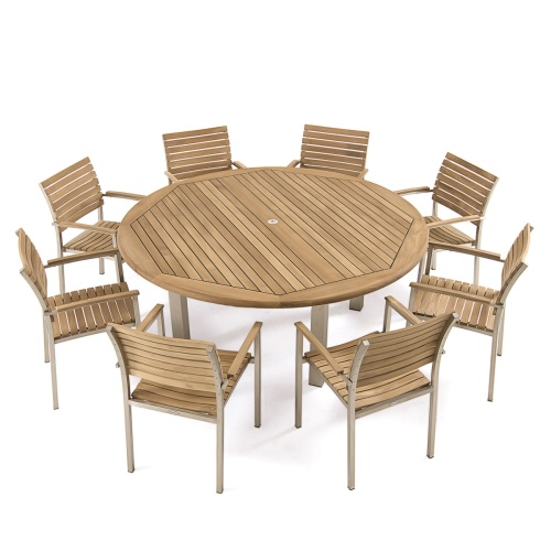 With the interplay of 304 Stainless Steel and Teak Wood, the Vogue Dining Set for 8 makes a bold statement in any space. The gently curved backrests and scooped seats of the Vogue Chairs offer lasting comfort even without cushions. The Vogue table is caulked with Sikaflex, a high-grade polyurethane sealant that prevents liquids from seeping through while providing a nautical appeal.Part of the Vogue Collection.