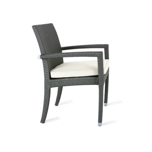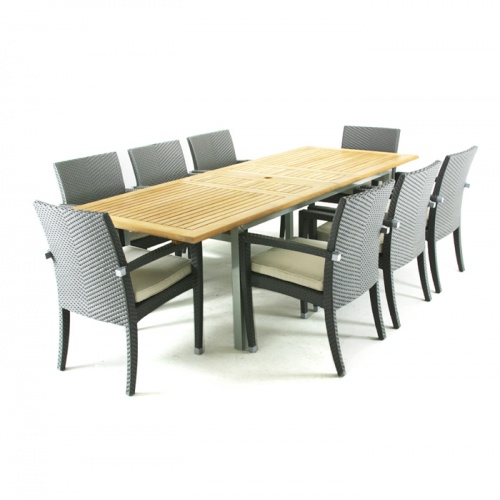 The set consists of a double extension dining table constructed from teak table top with durable aluminum frame and legs, and a set of 8 Sumba all weather wicker armchairs. The all synthetic wicker fibers of the Sumba armchairs are made of fibers that have been specifically engineered to replicate not only the look and feel of natural rattan and wicker but to endure the rigorous of outdoor conditions such as UV exposure from sunlight, extreme temperature variances, mold and mildew. As with all Westminster's teak furniture, the table top is crafted from eco-friendly premium grade A teak from sustainable plantations.