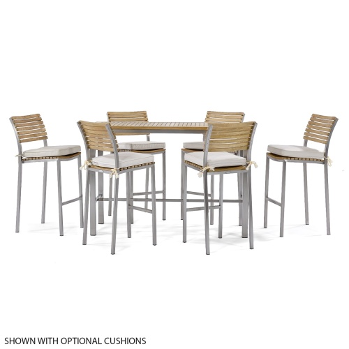 With the interplay of 304 Stainless Steel and Teak Wood, the Vogue 7 pc Bar Table Set is a bold example of traditional craftsmanship and modern design. The contoured backrests and seats of the Vogue Bar Stools offer lasting comfort. The bar table slats are caulked with Sikaflex, a high-grade polyurethane sealant that prevents liquids from seeping through, as well as providing a nautical appeal.