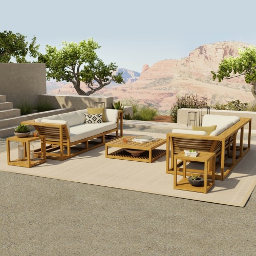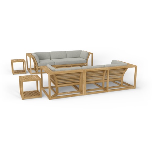 The Maya Collection is a modular system with plush, deep cushions atop clean-lined solid teak frames that give the impression of visual lightness, while its (6") wrap around armrest allow ample space for drinks yet are sturdy enough to sit on. This set can be used to create twin sofas, complete with their own side tables. The Maya Ottoman can be used as a coffee table or footrest, or provide additional seating. Versatile and functional, this collection can be arranged in a wide range of configurations depending on your needs and imagination.