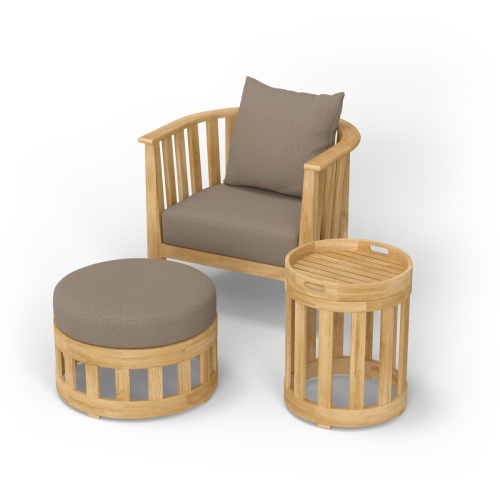 The welcoming shape, whimsical slats, and the warmth of teak makes the Kafelonia Club chair difficult to resist. Deep, plush cushions on generously proportioned frame allows "unrestricted movement" for comfort in seating over extended periods of time. The side table includes a removable serving tray, designed to sit seamlessly on the table top. The Kafelonia Ottoman has a Velcro attachable cushion and doubles as a coffee table or additional seating. The pure forms and modern simplicity of each piece is a true reflection in timelessness.