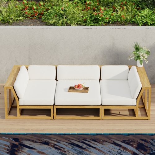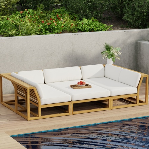 Plush, deep cushions atop clean-lined solid teak frames that give the impression of visual lightness while the Maya 6" wrap around armrests allow ample space for drinks, yet are sturdy enough to sit on. This set creates a full daybed, providing ample space for lounging with a book or with someone special. Versatile and functional, this set can be paired with other pieces from the Maya collection to create a wide range of configurations depending on your needs and imagination.