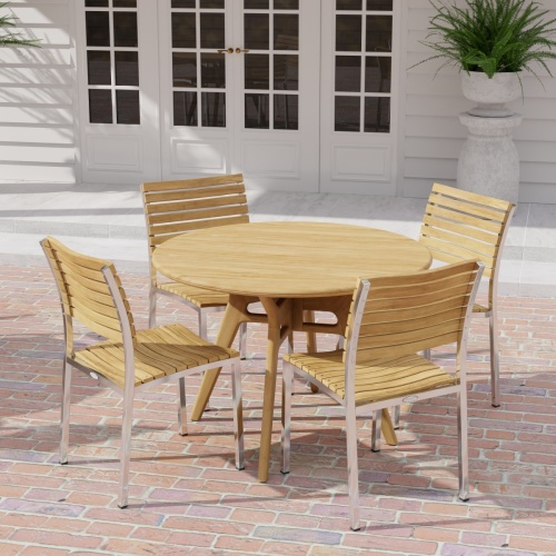 The Surf Vogue Dining Set is a classic Cafe style set, built with traditional craftsmanship with modern comfort in mind. The arbitrary yet clean lines of the Surf Folding Table lend it a light and airy appearance. Its irresistibly smooth tabletop allows it to be an excellent choice for the indoors, though it is more than robust to endure the test of time and the outdoors. With the interplay of 304 Stainless Steel and Teak Wood, the Vogue Side Dining Chair defines contemporary dining. A curved backrest and seat offer lasting comfort even without cushions while the chair's architectural details provide a distinct modern appeal.