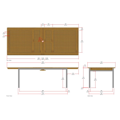 Table - 78.75/90/102" L x 39.25" W x 29.25" H Chair-23.5" L x 22" W x 34.5" H Bench-47.25" L x 15.75" W x 16.5" H |