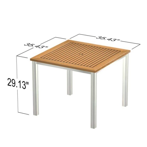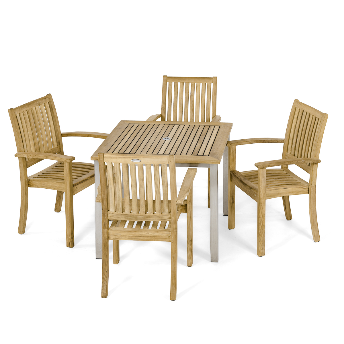 With the interplay of 304 Stainless Steel and Teak Wood, the Vogue Sussex Bistro Dining Set defines contemporary dining. The seat and back of the Sussex Stacking chairs have numerous, closely placed, vertical slats that are gently arched for comfort. Wide arms accommodate for a variety of occupant body-types. The Vogue Bistro Table's slats are caulked with Sikaflex, a high-grade polyurethane sealant that prevents liquids from seeping through while providing a nautical appeal. Durable and functional, this set will stand up to the test of time and the outdoors.
