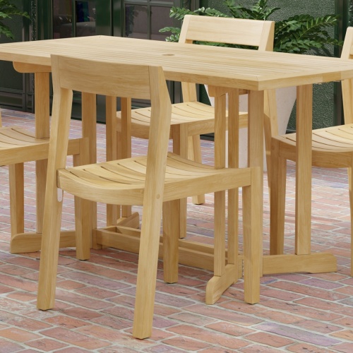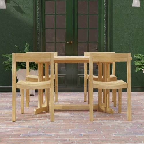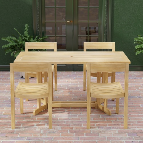 With clean lines and welcoming curves, the 5 piece Nevis Horizon Dining Set is immediately appealing. First impressions hardly reveal that the exceptionally comfortable Horizon Chairs which stack for easy storage and accept optional cushions to add to the comfort. Generously scaled and visually robust, the chairs are relatively lightweight yet structurally strong given their solid teak stature.