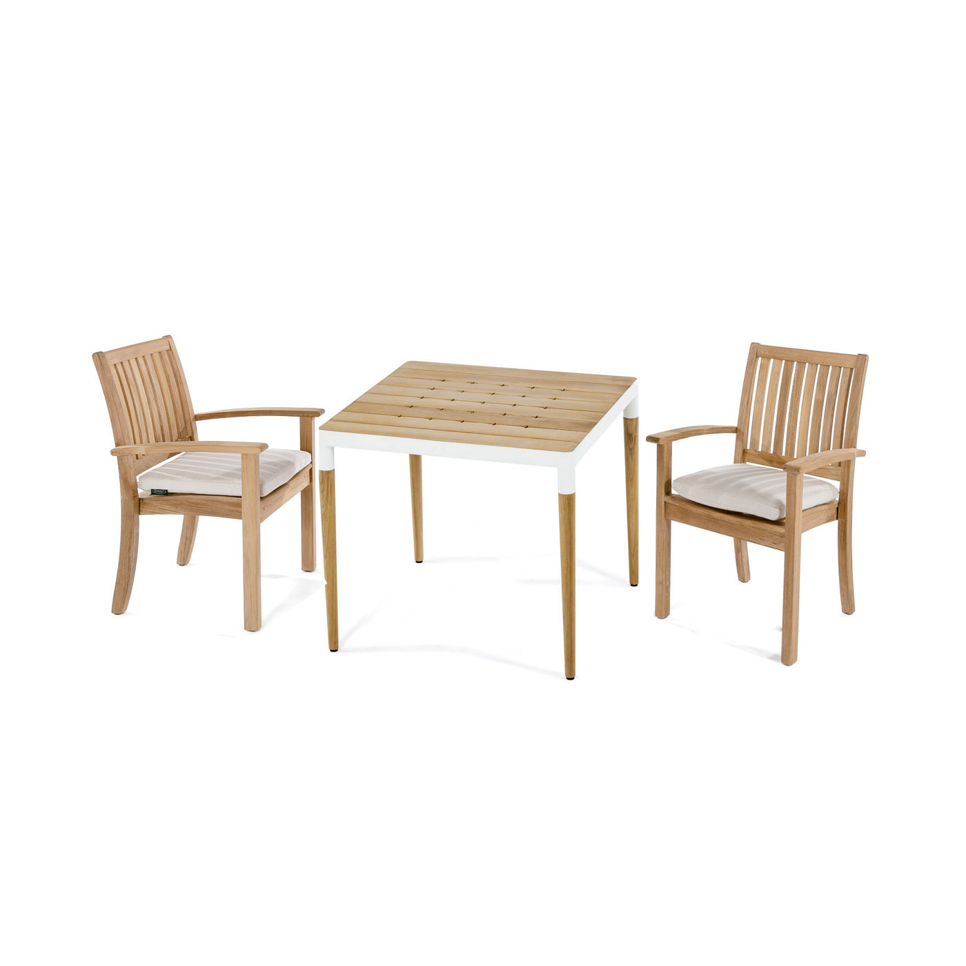 Defined by the stunning contrasts of refreshing white powder coated aluminum and the warmth of micro-smooth teak, this Bloom Sussex Bistro Set emanates a chic sense of style. Our Sussex Teak Stacking Armchair is constructed with ample amounts of Grade A teak wood. The seat and back have numerous, closely placed, vertical slats that are gently arched for comfort. Wide arms accommodate for a variety of occupant body-types.