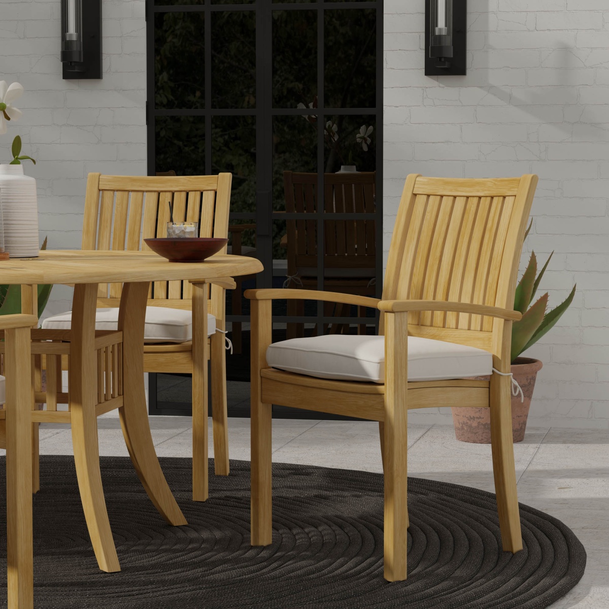 Our Sussex Teak Stacking Armchair is constructed with ample amounts of Grade A teak wood: The seat and back have numerous, closely placed, vertical slats that are gently arched for comfort. Wide arms accommodate for a variety of occupant body-types.
