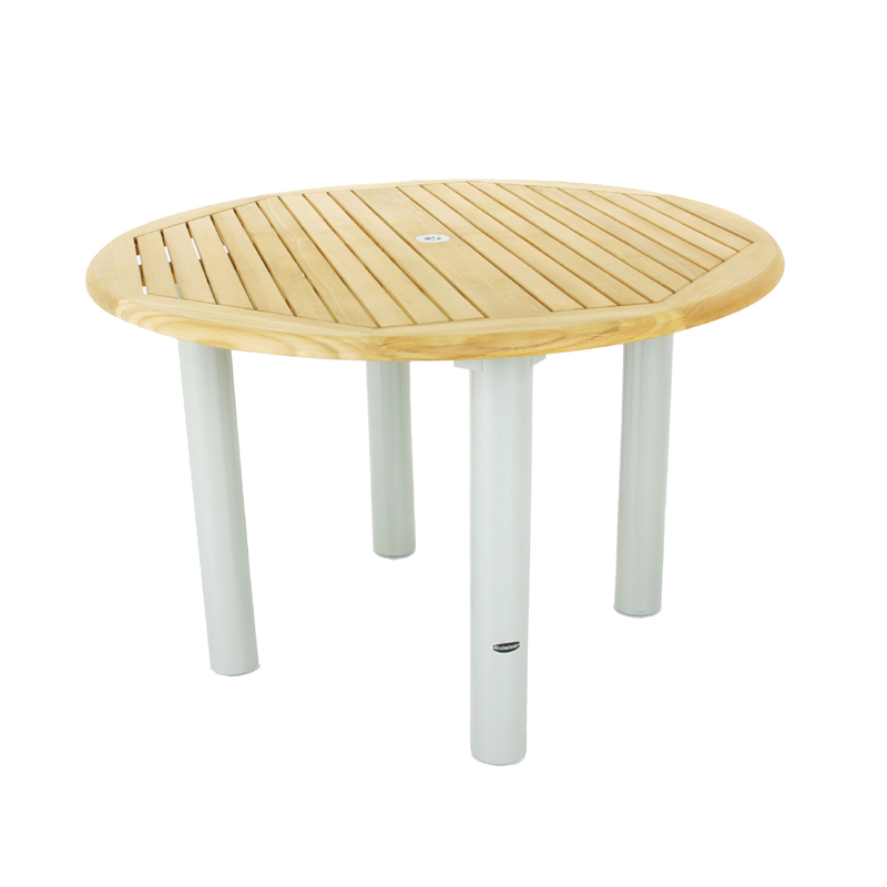 The 4ft round Gemini table features our micro-smooth teak table top and light weight yet sturdy and durable aluminum legs. Great for both poolside or under the patio. Crafted from Eco-friendly premium grade A teak from sustainable plantations.