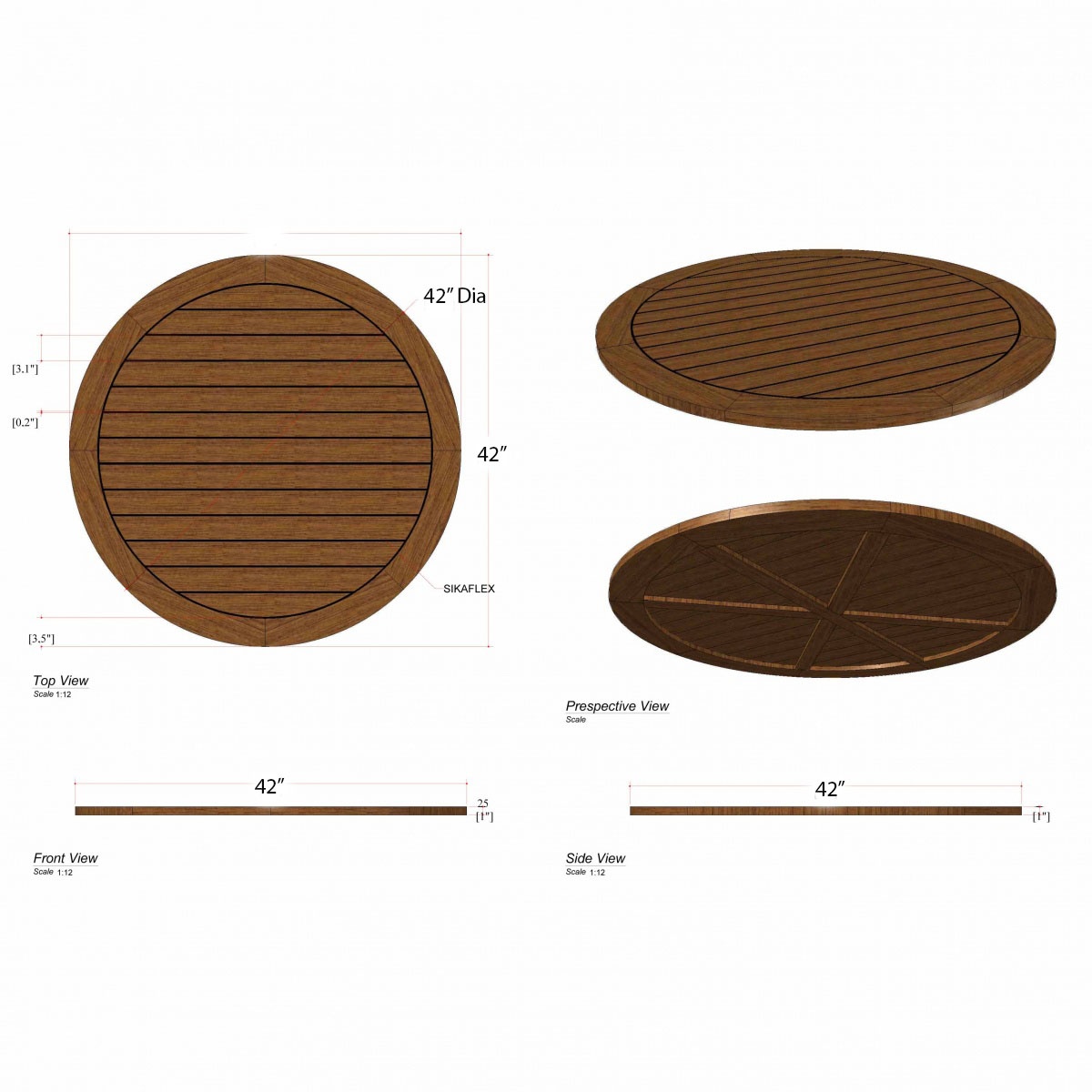 The 42" Dia x 1" Vogue Round Cafe Table Top defines contemporary outdoor dining. The tabletop is caulked with Sikaflex, a high-grade polyurethane sealant that prevents liquids from seeping through while providing a nautical appeal. This wood table top fits Gar Bases perfectly.