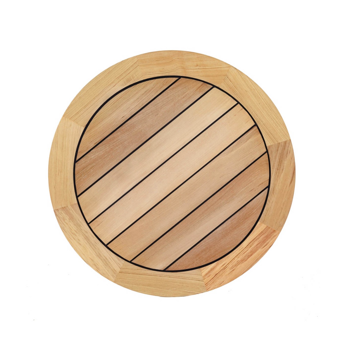 The 36" Dia x 1" Vogue Round Cafe Table Top defines contemporary outdoor dining. The tabletop is caulked with Sikaflex, a high-grade polyurethane sealant that prevents liquids from seeping through while providing a nautical appeal. This particular table top has a Reverse Bevel Teak Table Edge which fades in at the bottom to give a more contemporary bold style that surely gives a statement. This wood table top fits Gar Bases perfectly. Part of the Vogue Collection.