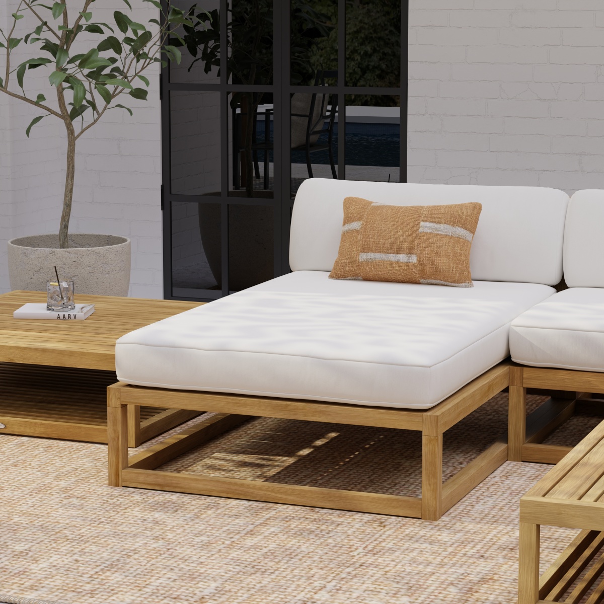 The Maya Teak Chaise Daybed can be used alone as a lounger or can be combined with other pieces from the Maya Collection. Plush cushions sit atop a minimal but extremely sturdy teak frame, giving the daybed the impression of lightness.