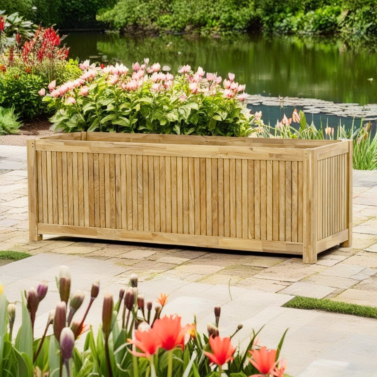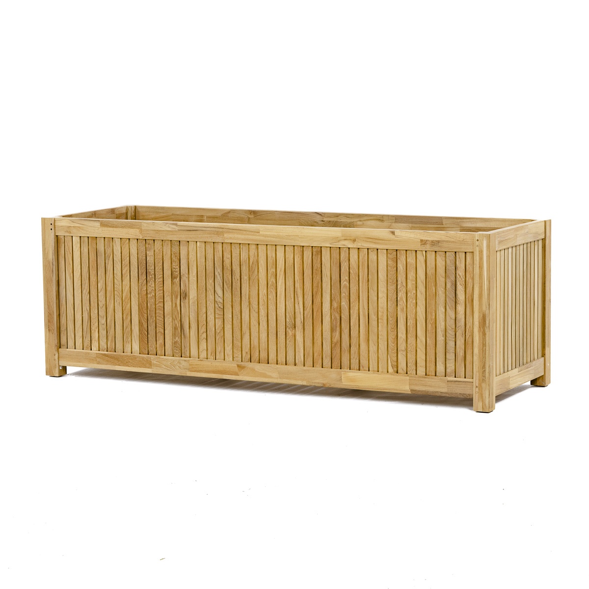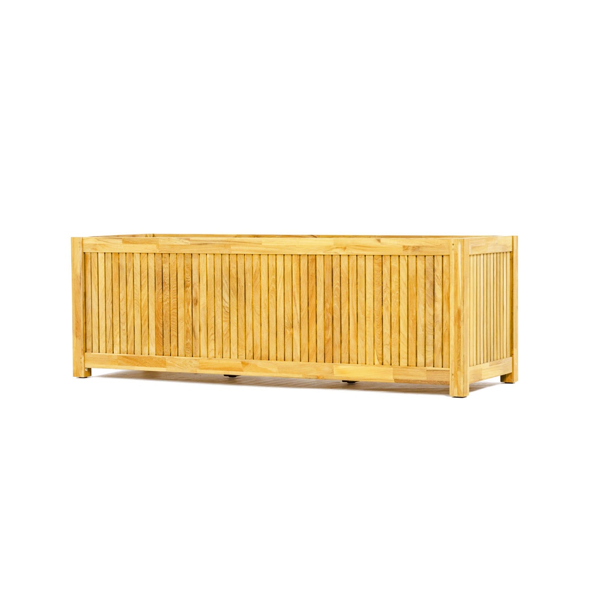 With generous proportions of teak wood and traditional craftsmanship, our rectangular planter box adds a bold yet simple style to any garden space. Whether holding flowers, herbs, or even shrubs, this planter will endure the test of time and the outdoors.