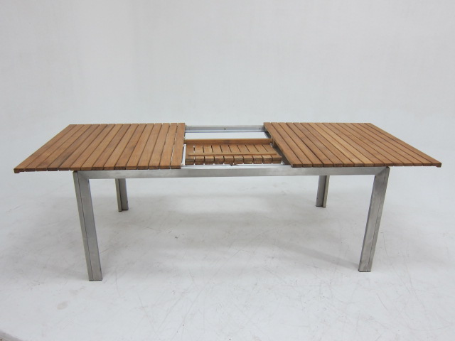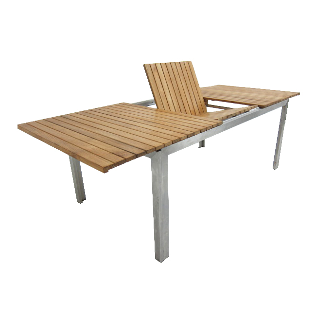 The Selena stainless steel and teak extension table has a beautiful butterfly extension leaf system which seamlessly folds the leaf into the table until ready for use. The design of this outdoor extension table pairs two very durable materials, that elegantly blend classic with modern for a timeless outdoor dining experience as it echoes the warmth and beauty of its indoor counterpart.