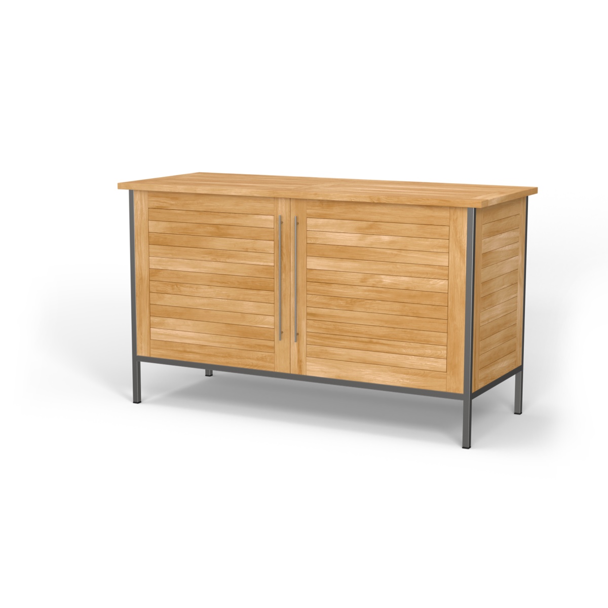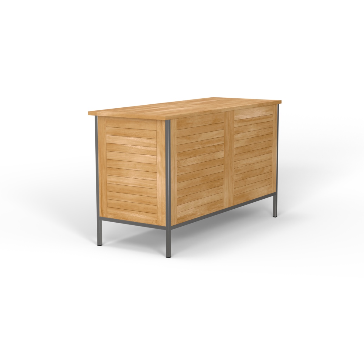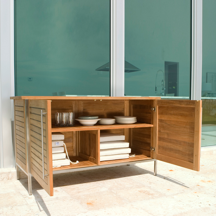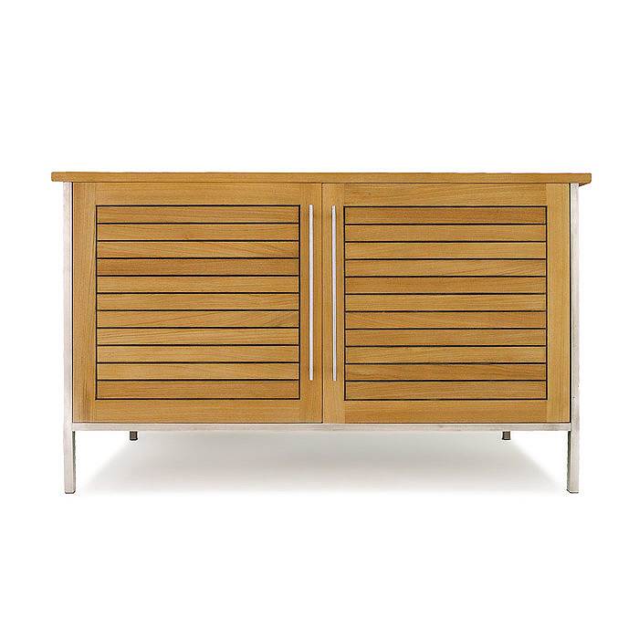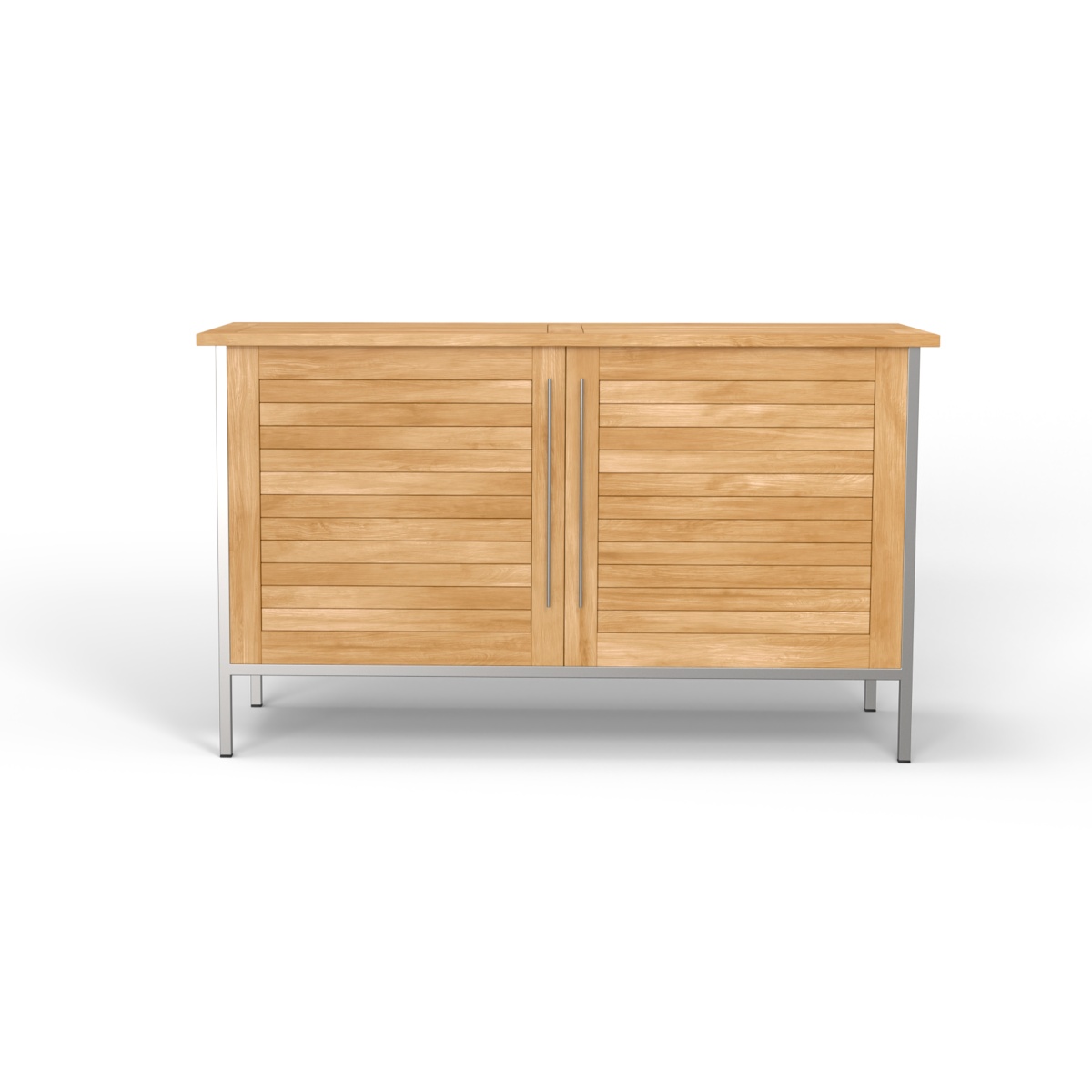 With the interplay of 304 Stainless Steel and Teak Wood, the Vogue Sideboard combines traditional craftsmanship and modern design. Constructed with a stainless steel frame, door pulls, hinges, and solid teak panels, its bold clean lines complement any style. It provides abundant space for outdoor storage needs, from tableware and cushions to pool accessories and towels, while keeping contents dry and readily available. The Vogue Sideboard easily doubles as a serving station. Part of the Vogue Collection
