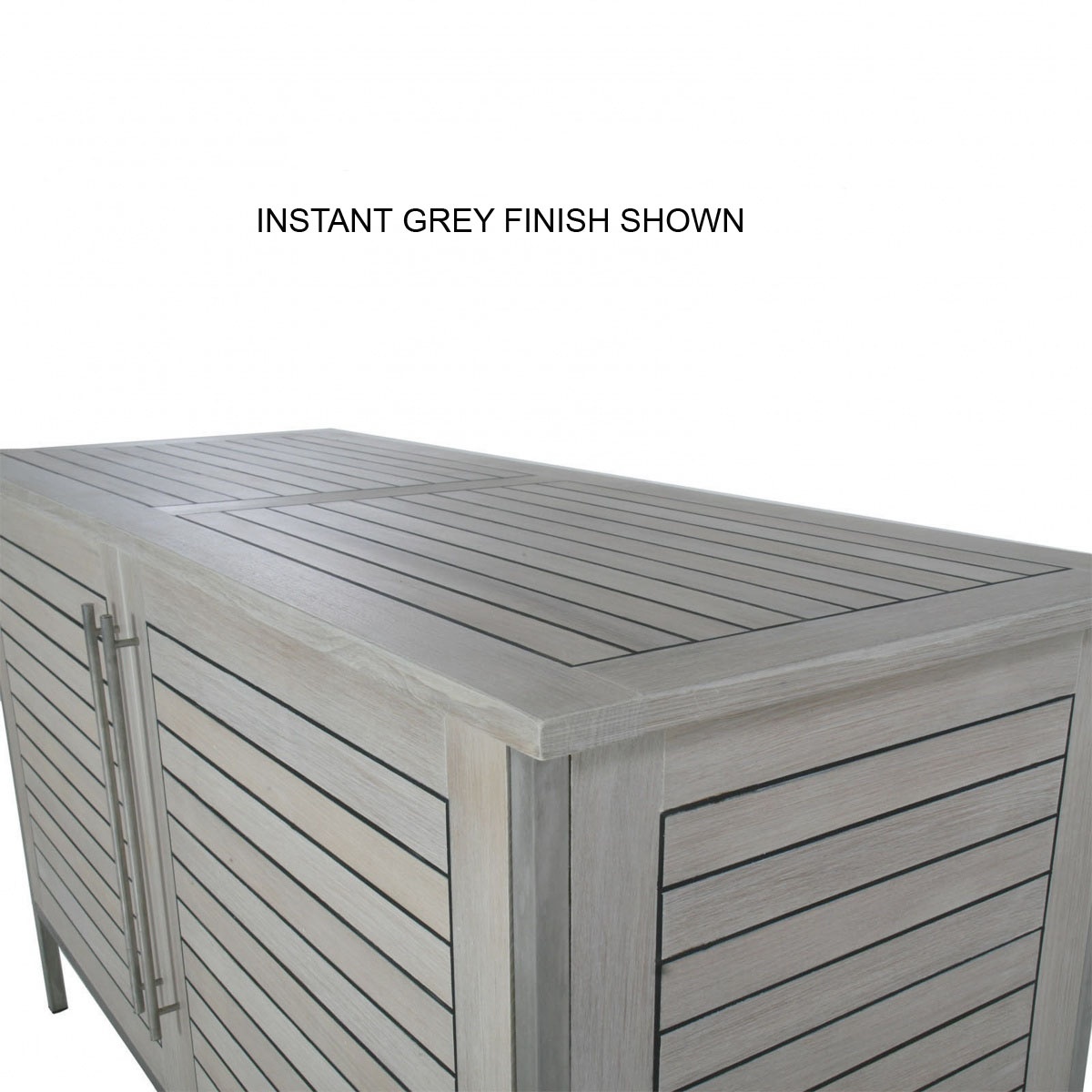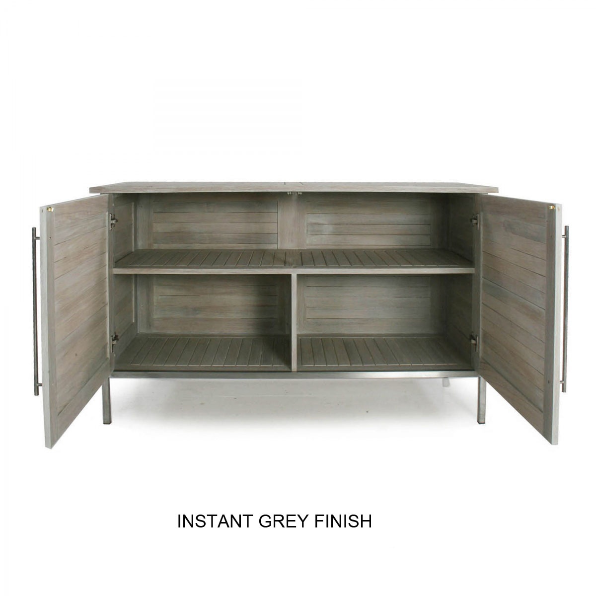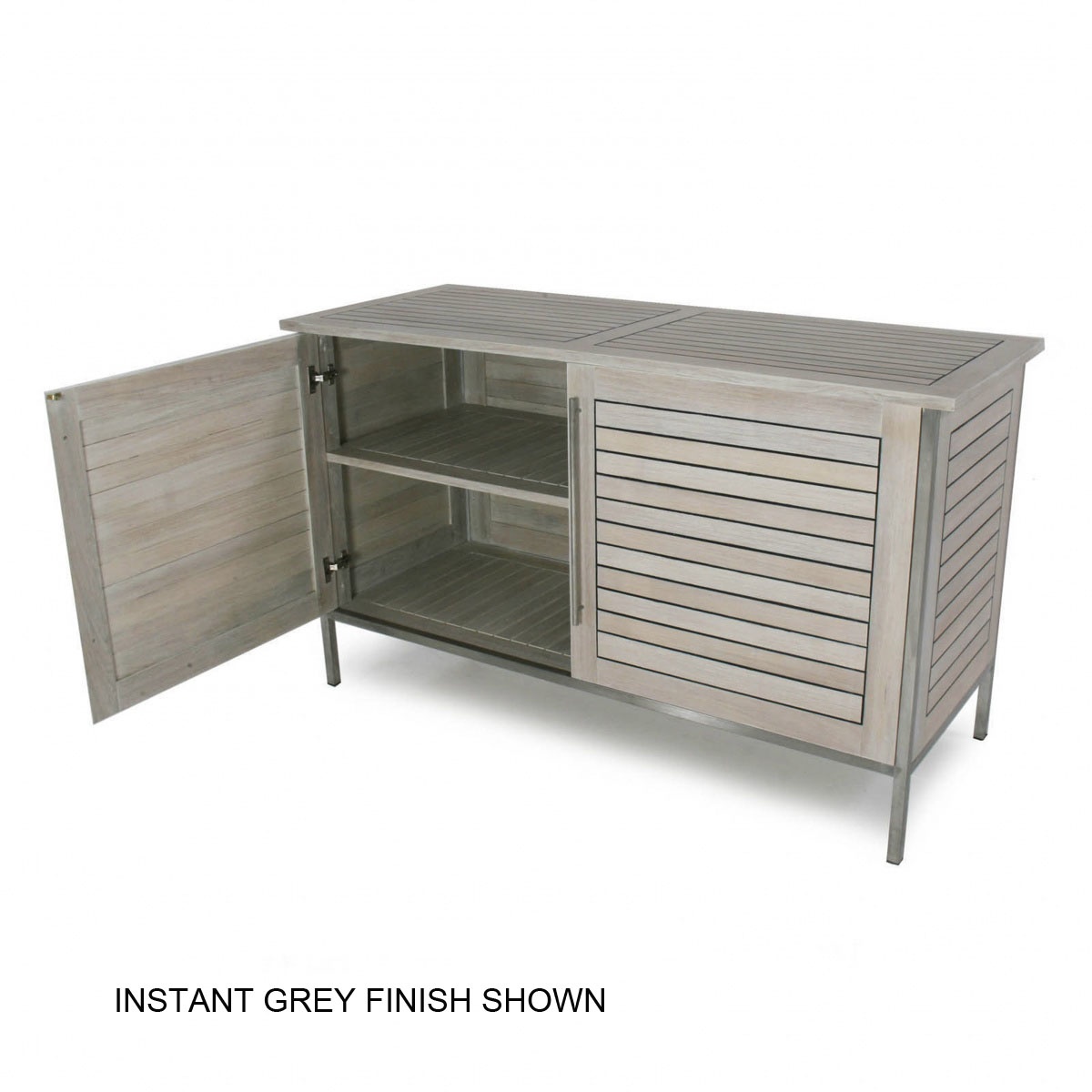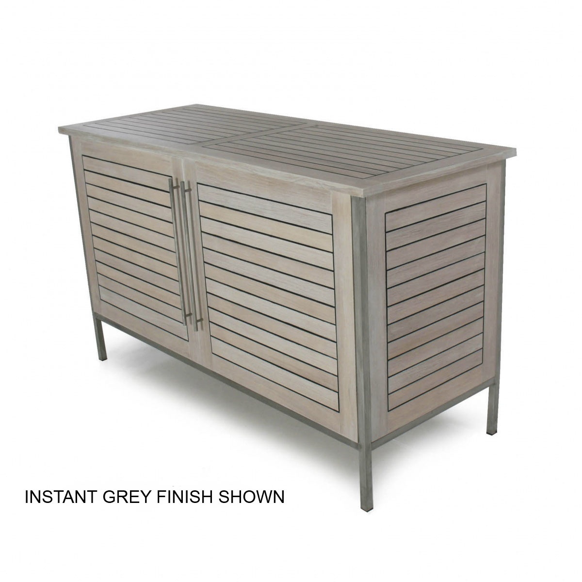 With the interplay of 304 Stainless Steel and Teak Wood, the Vogue Sideboard combines traditional craftsmanship and modern design. Constructed with a stainless steel frame, door pulls, hinges, and solid teak panels, its bold clean lines complement any style. It provides abundant space for outdoor storage needs, from tableware and cushions to pool accessories and towels, while keeping contents dry and readily available. The Vogue Sideboard easily doubles as a serving station. Part of the Vogue Collection