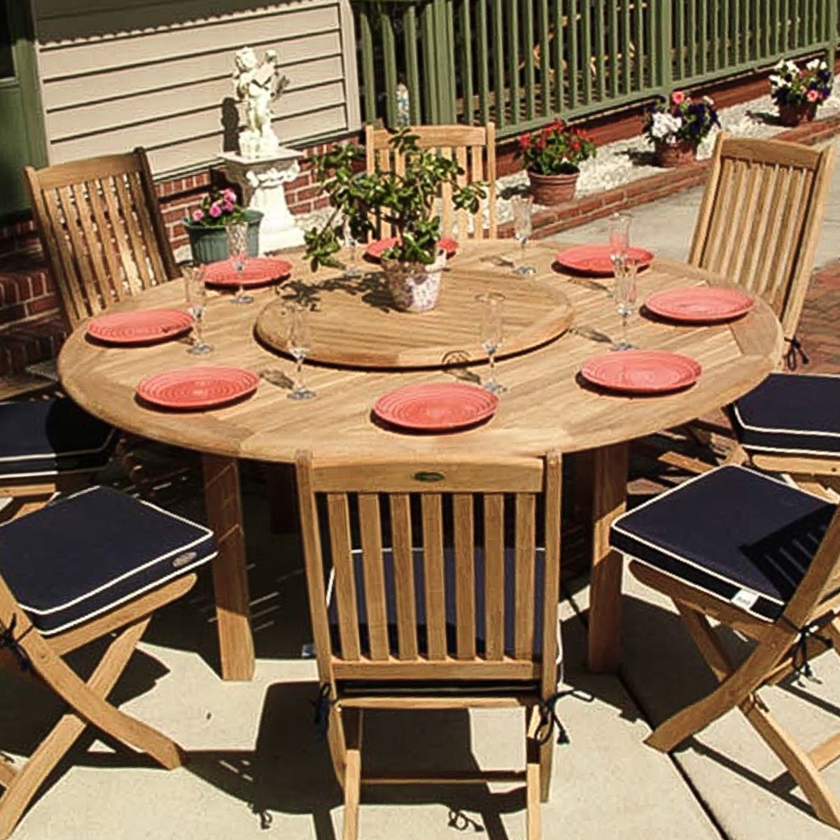 Buckingham Teak Table: Large Levelers Barbuda Teak Folding Chair: Glides |