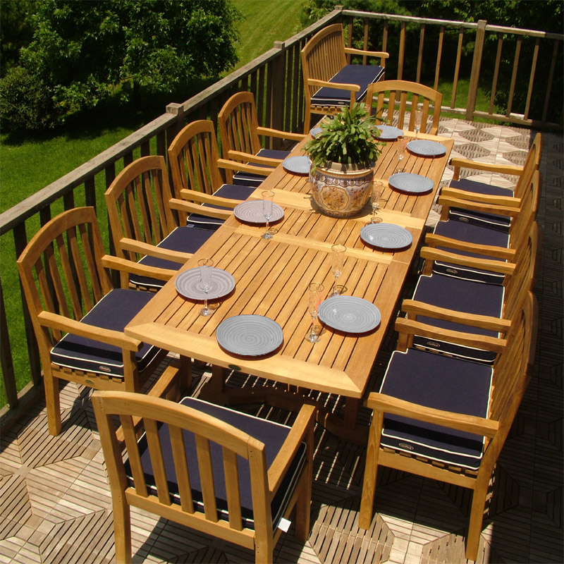 The Curved Dining Armchair Set for 8-12 upholds the traditional craftsmanship of teak furniture. The curved backrests and seats of the dining chairs maximize comfort even without cushions, while the versatility of the extension table allows for groups of 8-12 depending on your needs. From small luncheons to an evening soiree, this dining set will provide a lifetime of memories with friends and family.