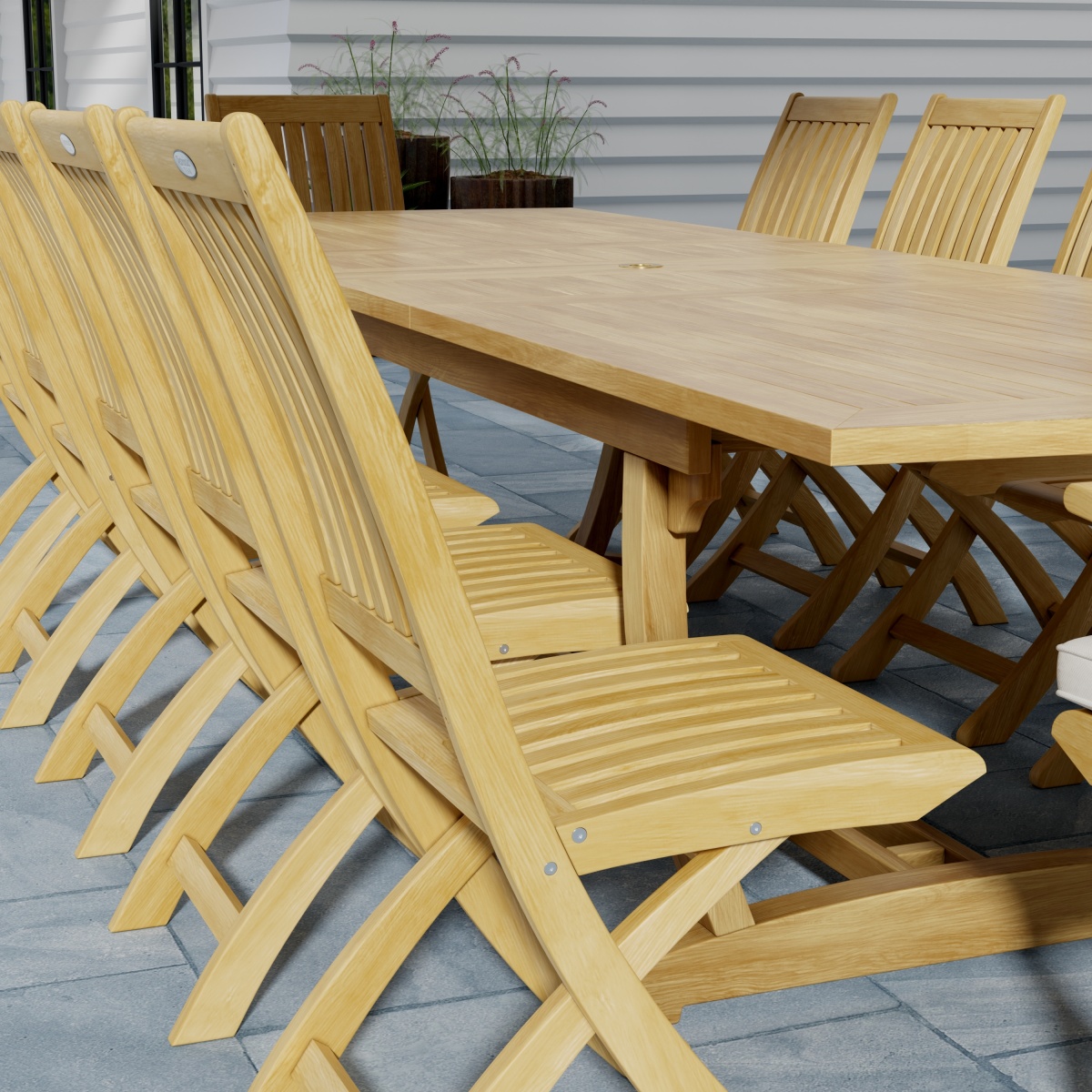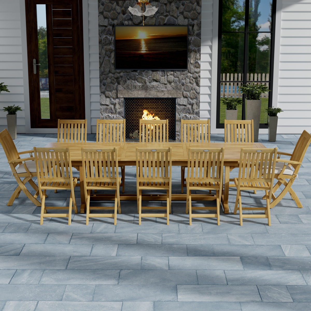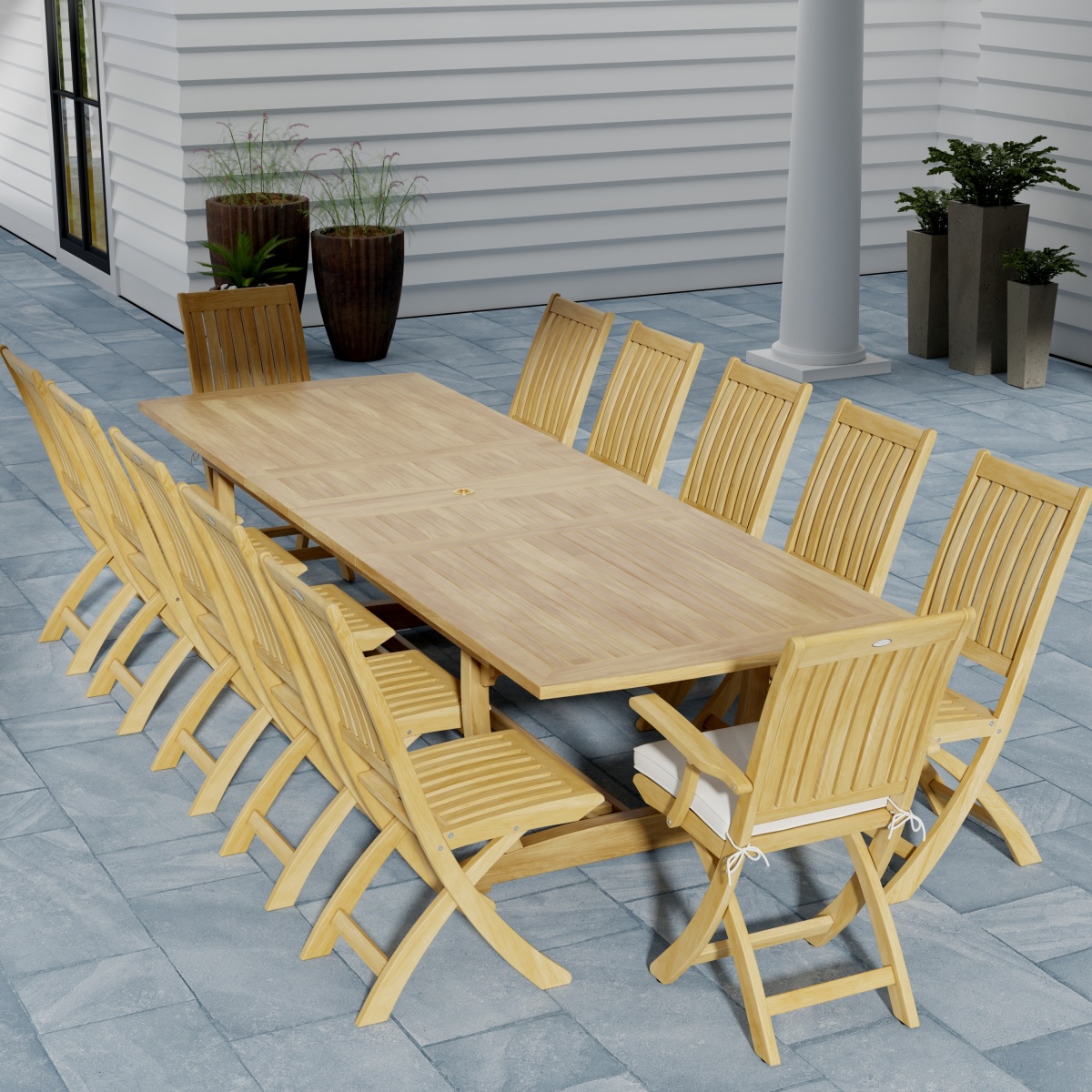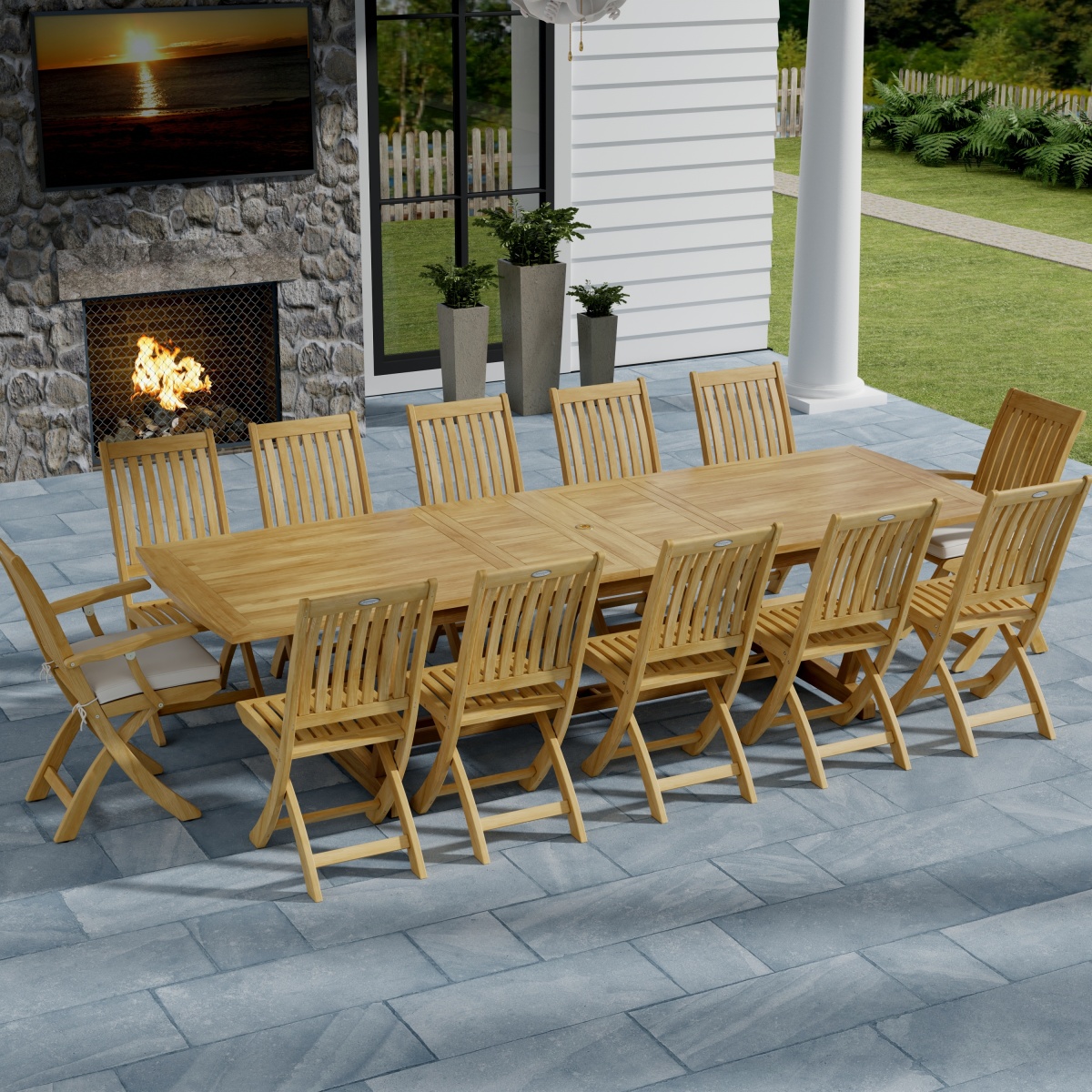 The Grand Barbuda Dining Set for 12 unites traditional design with modern versatility. The Grand Veranda Table extends to seat 6-12, and the chairs fold for easy storage. So when you have unexpected guests, it is convenient to make more room by extending the table and setting out more chairs.