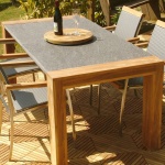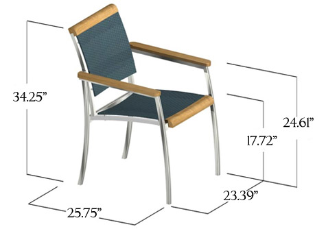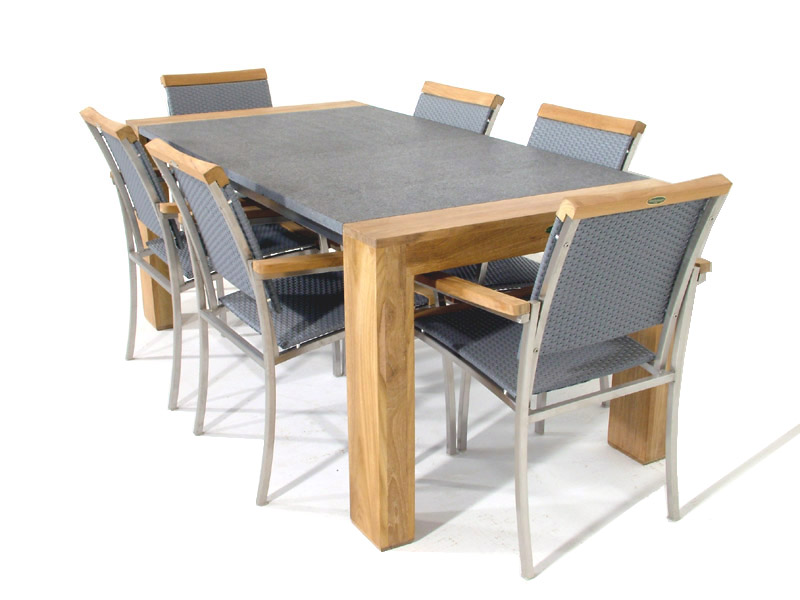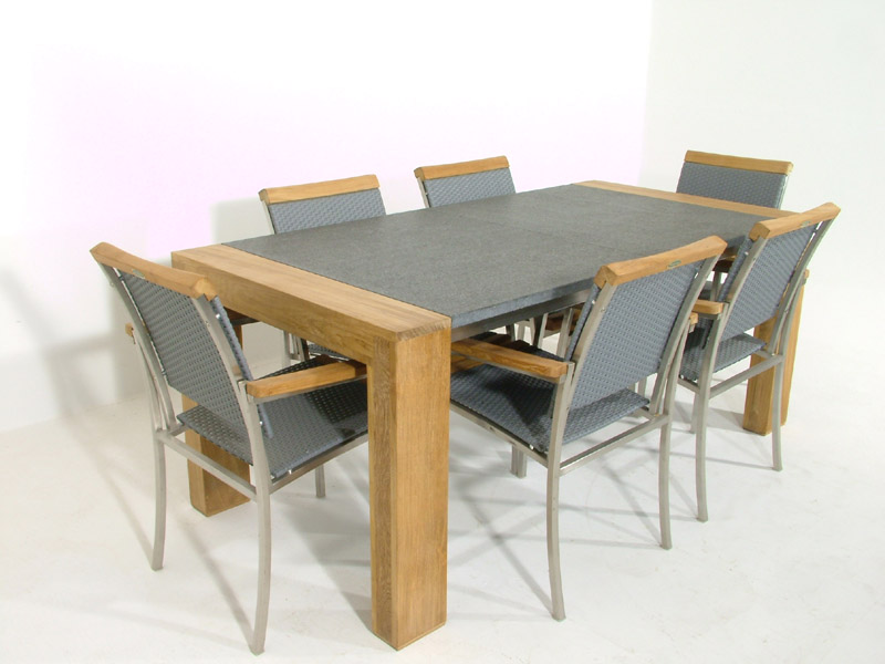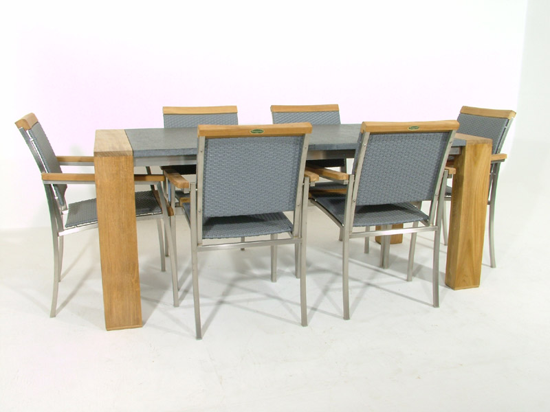 New for 2006, our SS Stackable Teak Arm chair & Granite Teak Table Set combines 1 Teak - Granite rectangular table with stainless steel supports and 6 Stainless Steel Stackable armchairs with teak arms and UV protected polyethylene, woven material that provides maximum comfort. WARNING!!....the Granite top is very heavy and will require two people to assemble it.