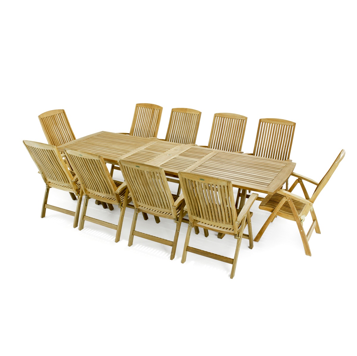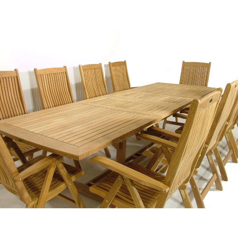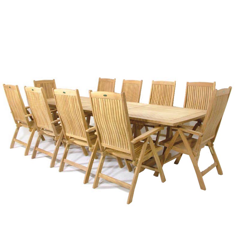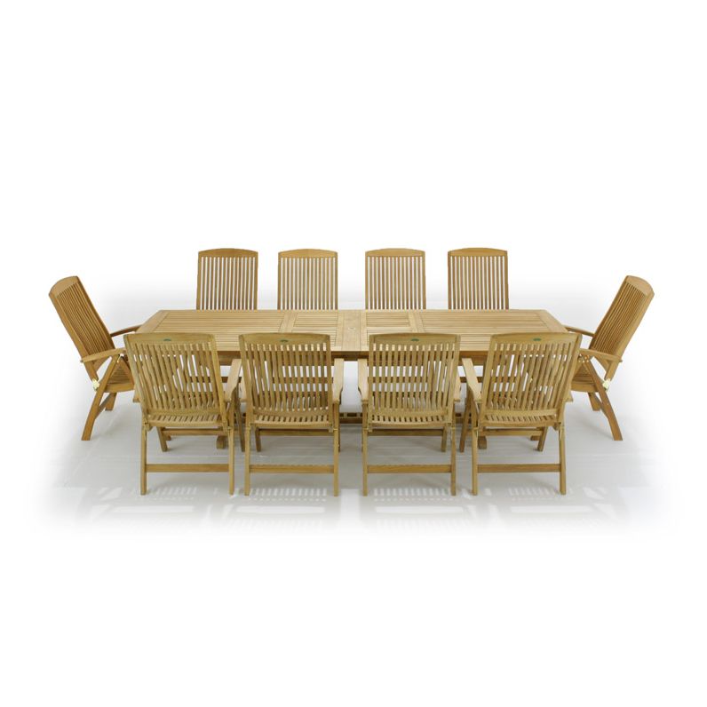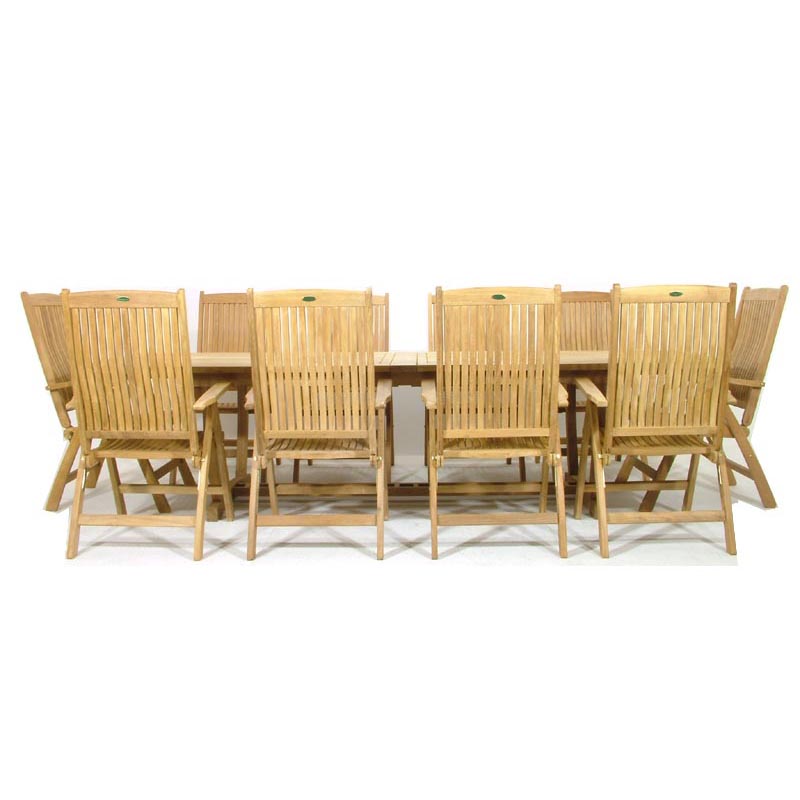 The 11 piece Barbuda Teak Patio Furniture Set combines the timeless craftsmanship of teak furniture while ensuring optimum comfort for dining and lounging. The Barbuda Recliner chairs, our most ample folding chair, offers six reclining positions and functions equally well as a dining chair or lounge chair. The Veranda Extension Table offers seating for 6-12. Extend or collapse the table to accommodate any size party, and quickly fold away or set up the chairs when you have unexpected guests.