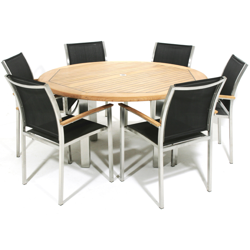 The Gemini round dining set is a uniquely modern interplay of two very durable materials for outdoor use, featuring (1) stainless steel and teak 5 ft outdoor table sealed with Sikaflex (for waterproofing) between the slats, (6) stainless steel and teak stacking armchairs with high performance UV and tear resistant black Textilene , a durable PVC coated fabric that is both mildew resistant and flame retardant. The strong breathable mesh conforms to the shape of the human form while allowing air circulation at contact points, which makes seating very comfortable. Chairs stack four high for easy storage.
