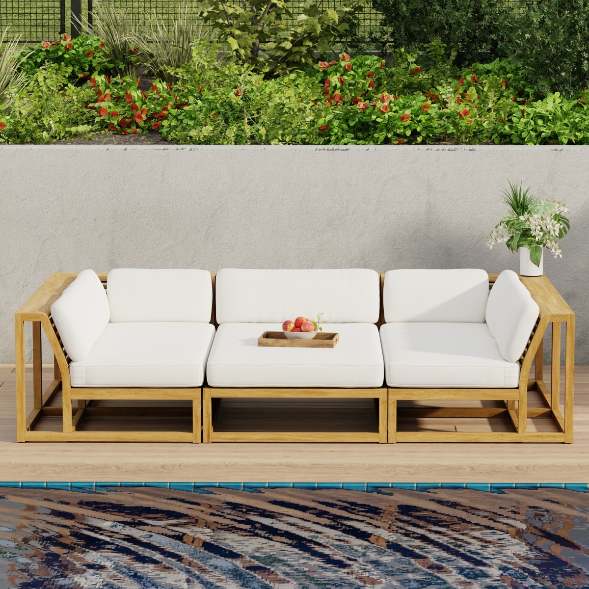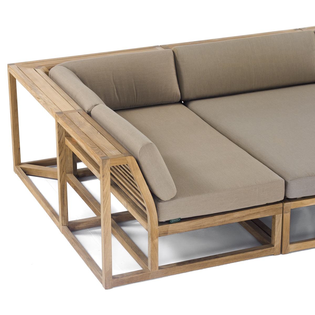 Plush, deep cushions atop clean-lined solid teak frames that give the impression of visual lightness while the Maya 6" wrap around armrests allow ample space for drinks, yet are sturdy enough to sit on. This set creates a full daybed, providing ample space for lounging with a book or with someone special. Versatile and functional, this set can be paired with other pieces from the Maya collection to create a wide range of configurations depending on your needs and imagination.