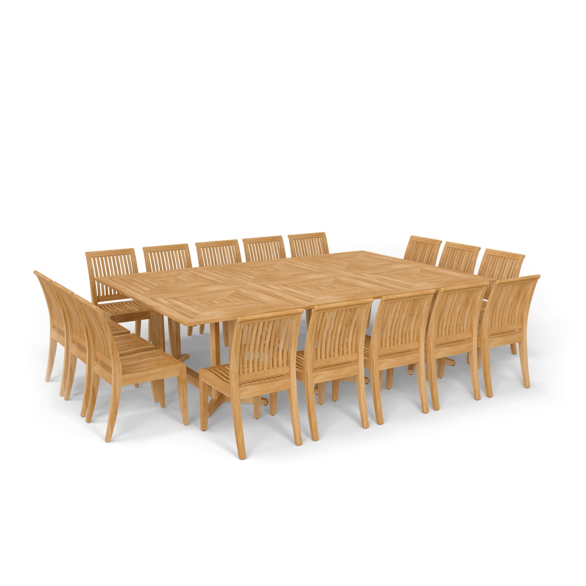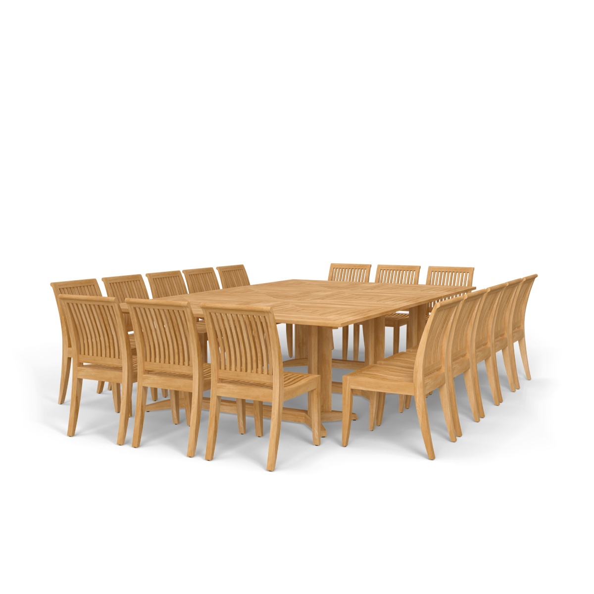 The extraordinarily elegant Pyramid Teak Outdoor Furniture 19 piece Set will make any gathering memorable with seating up to 16. This solid teak dining set is constructed using Mortise and Tenon joinery and then sanded to a micro-smooth finish that looks amazing and feels unbelievably smooth. Cushions are available in various colors from Sunbrella premium grade fabrics. Fully customizable into countless configurations for multiple seating arrangements. Perfect for Restaurant Seating or accommodating large events.