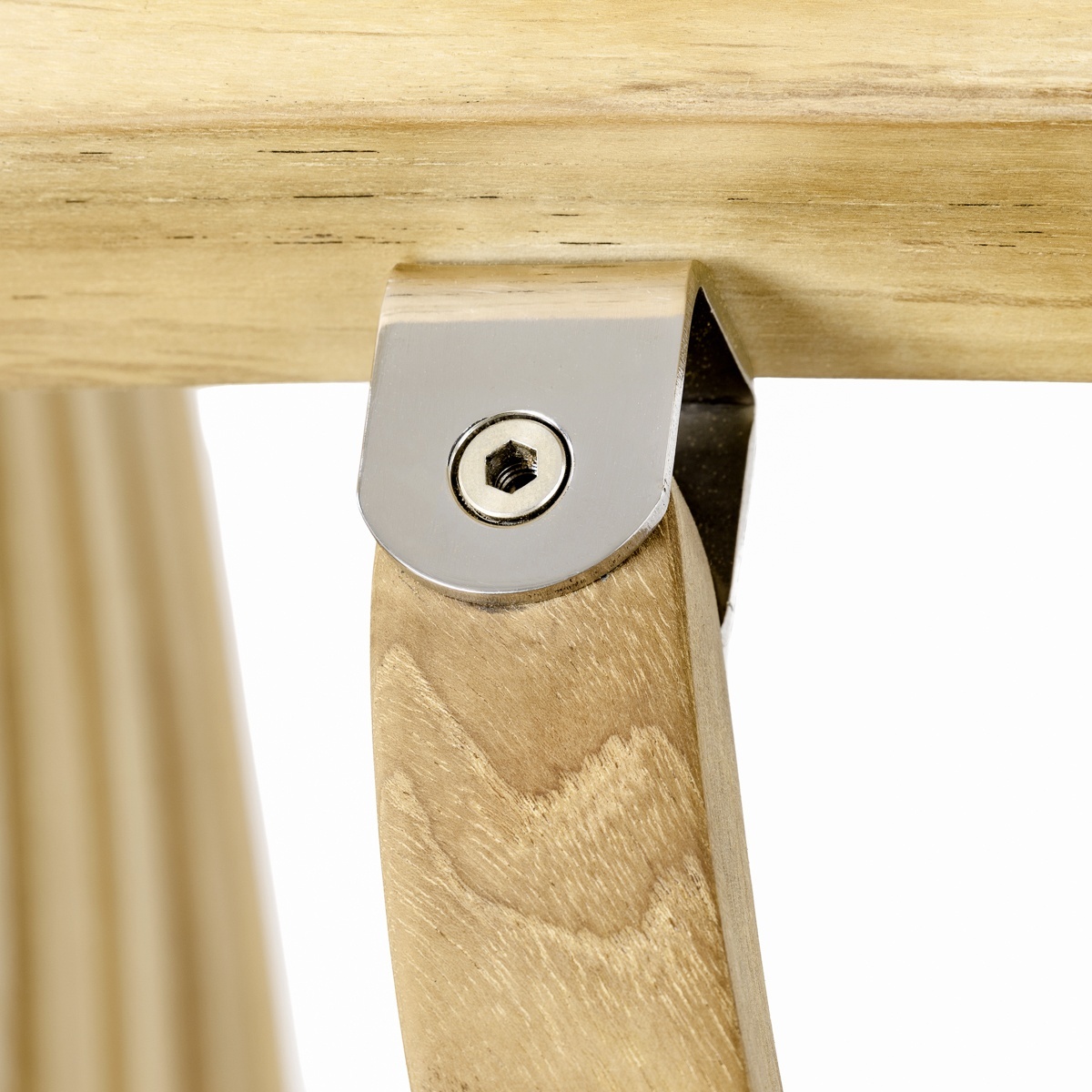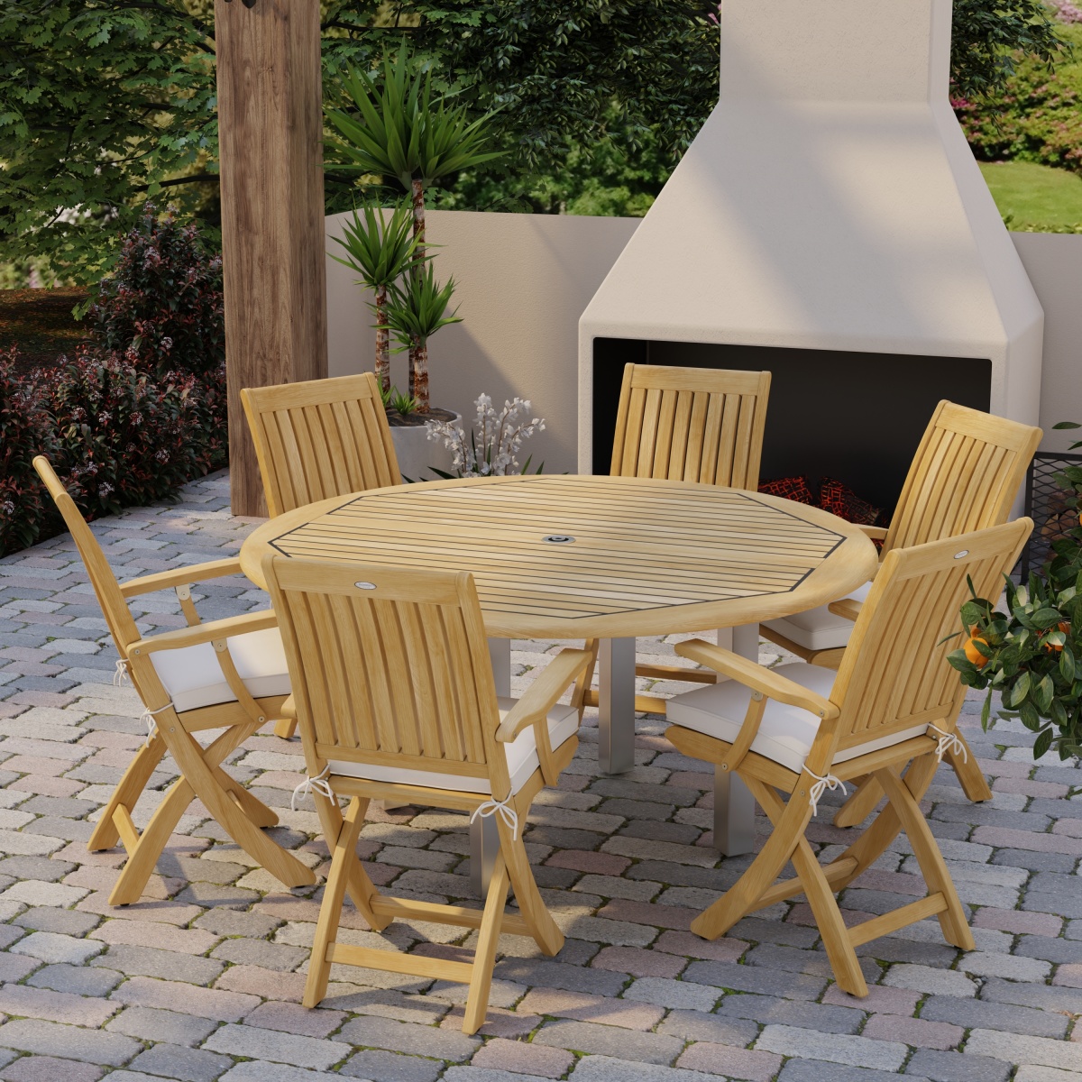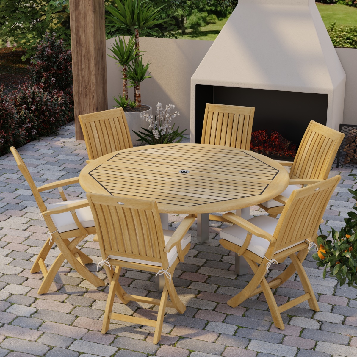 The Sophisticated Stylish Vogue Teak Round Barbuda Armchair Set for 6 made of premium teak and 304 stainless steel. This set includes our Vogue 5 ft Round Table with table slats that are lined with Sikaflex, a rubber sealant that forms a barrier to liquids and solids, and is complimented with the Barbuda Folding Armchair is precision engineered for long lasting durability, resulting in a beautiful chair that sits firm with no wobble.