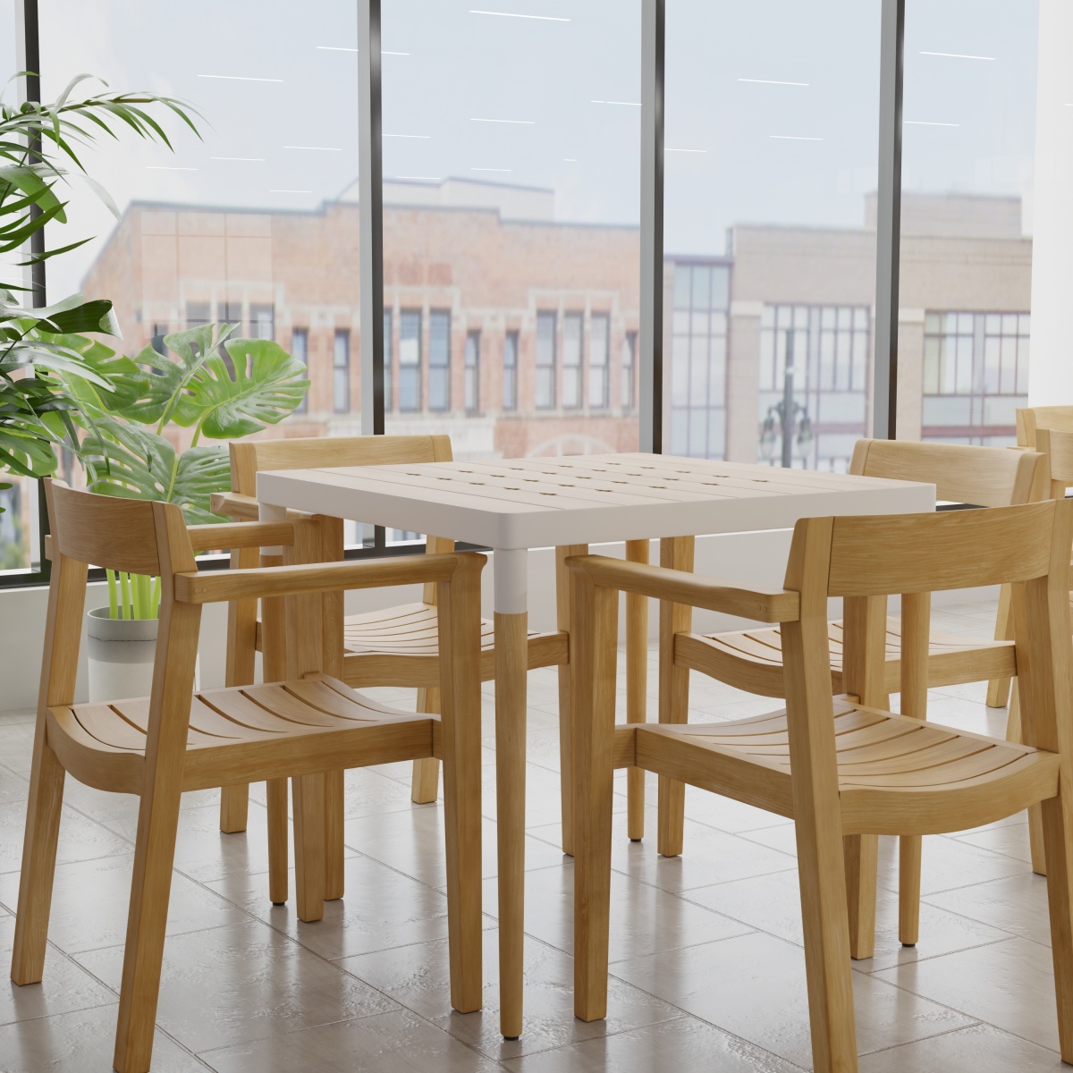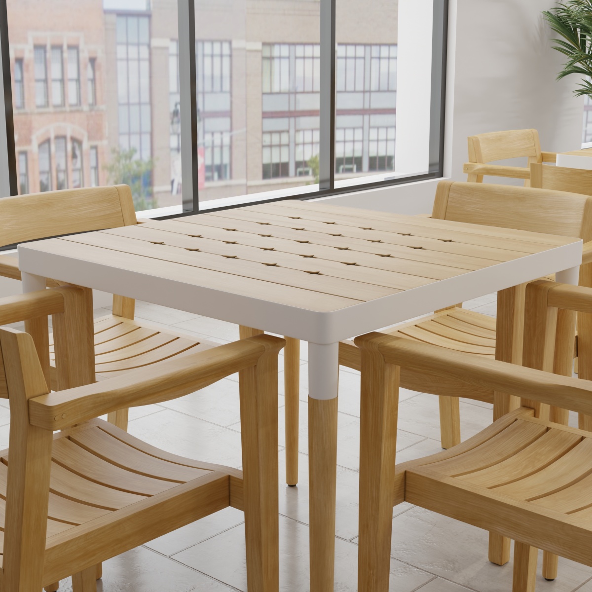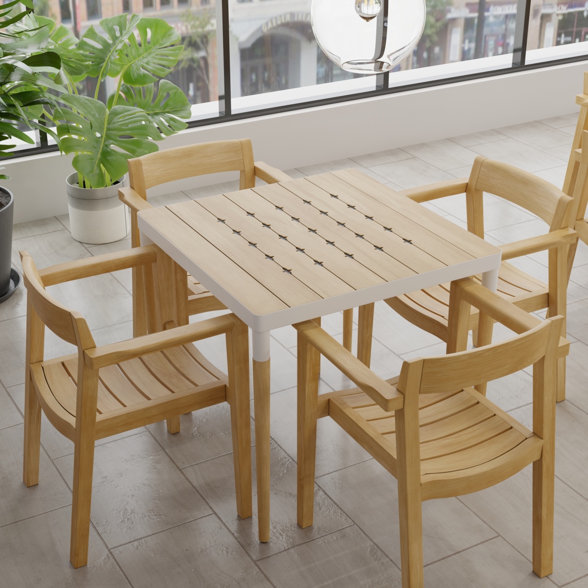 Defined by the stunning contrasts of refreshing white powder coated aluminum and the warmth of micro-smooth teak, this Bloom Horizon Square Dining Set emanates a chic sense of style. Our Horizon Dining Chair with hints of Danish modern design with its minimalist form while its gently curved backrest and seat offers lasting comfort. Pure in design and function as part of the Horizon Collection, the Horizon Dining Chair complements any space and style, whether indoors or out. Traditional craftsmanship ensures it will endure the test of time and the outdoors.