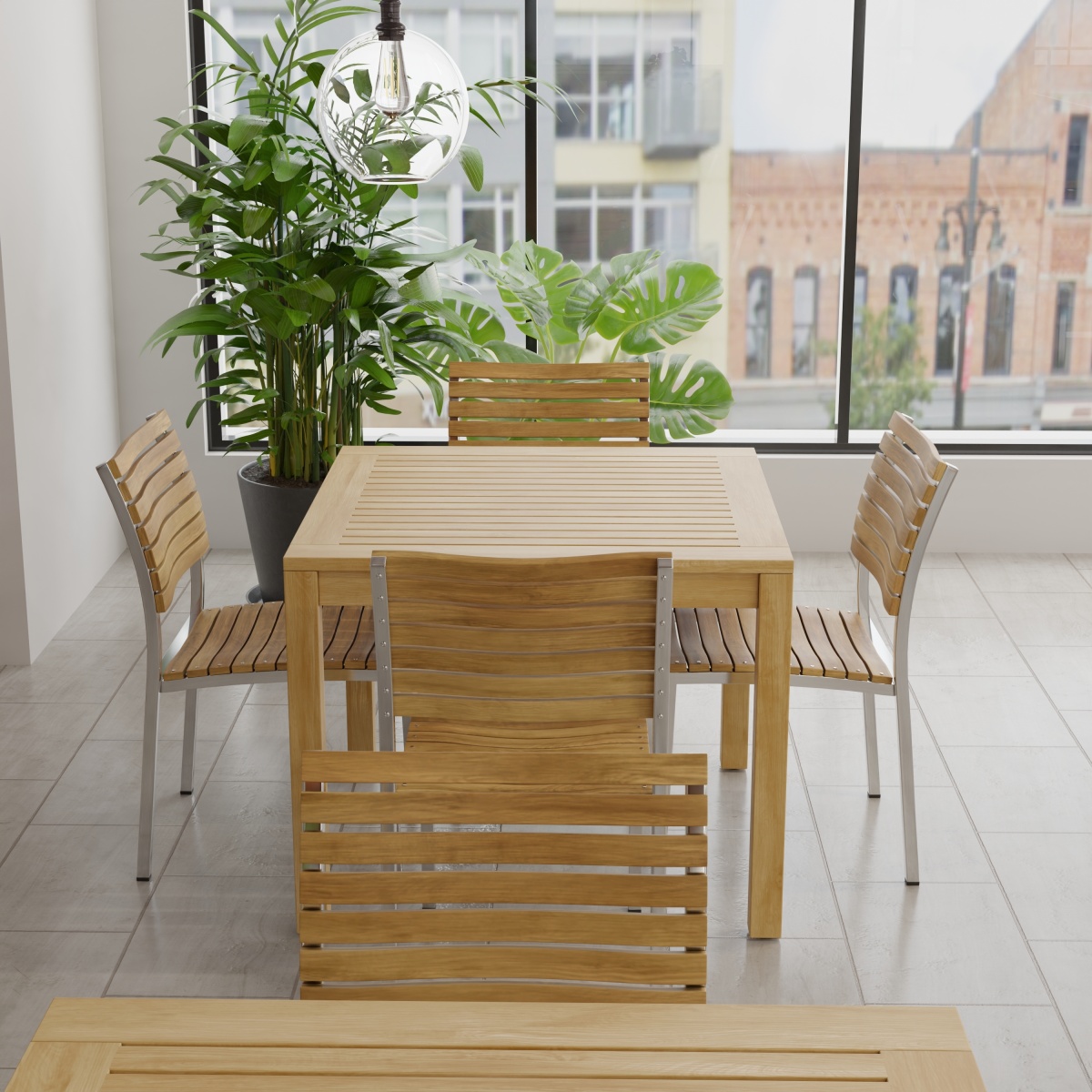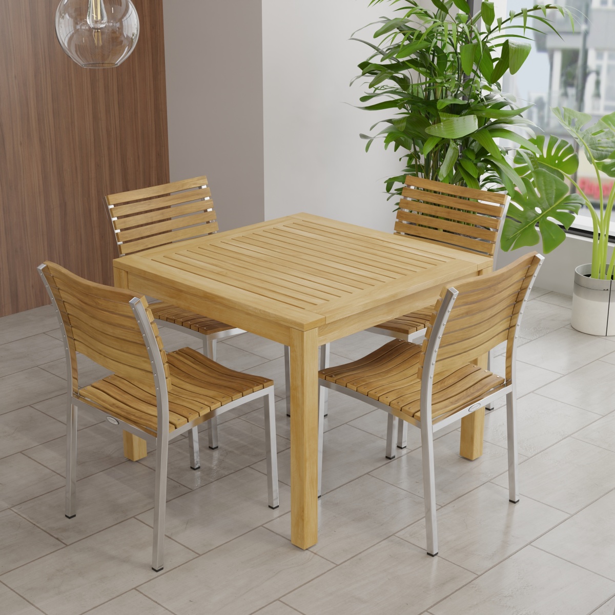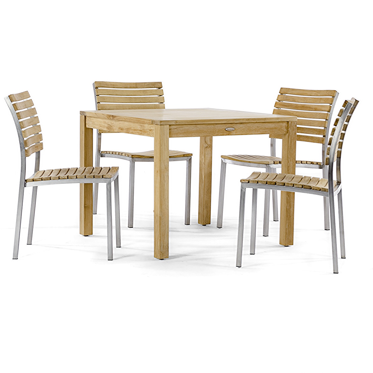 The Vogue 5 piece Bistro Set combines the traditional craftsmanship of the table with contemporary design in the union of teak and stainless steel in the Vogue Side Chairs. Ideal for smaller spaces such as on the balcony of a high-rise apartment or the deck of a yacht.