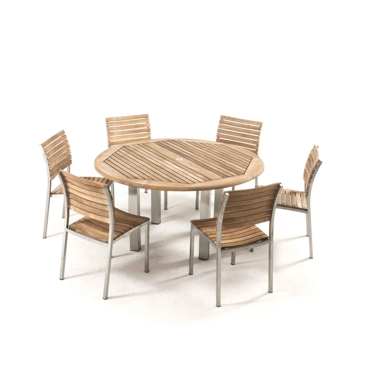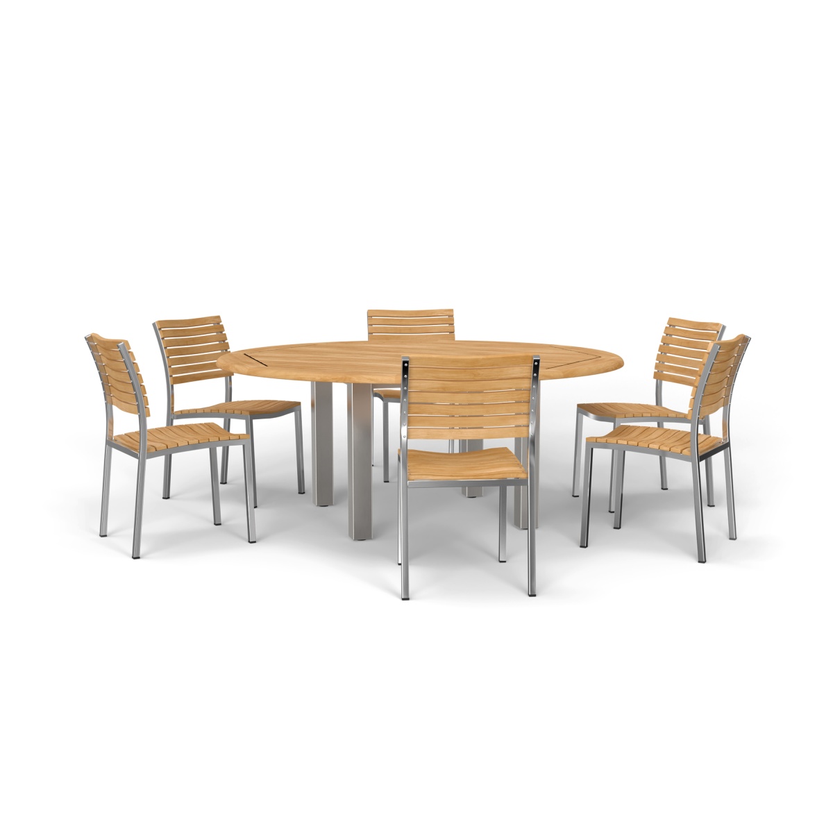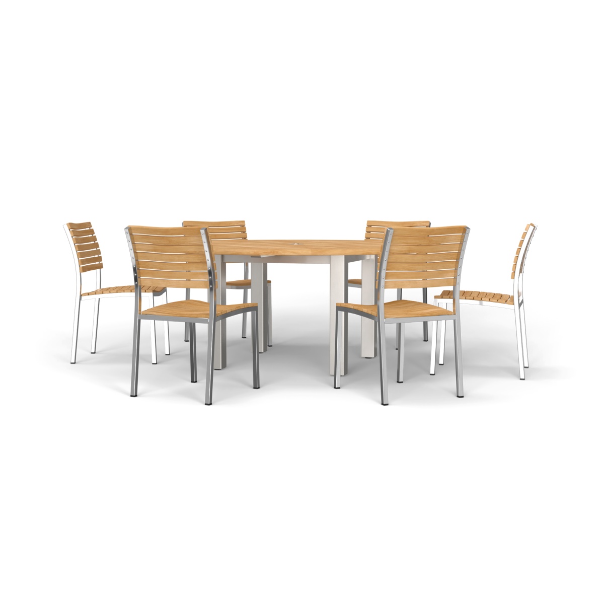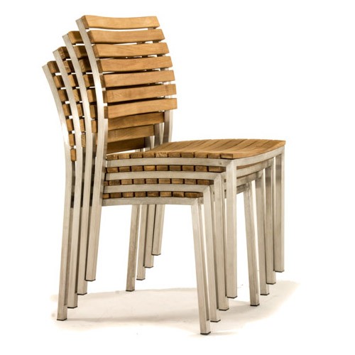 The simple elegance of this contemporary set with its interplay of mix materials of solid teak and stainless steel makes this handsomely designed collection an easy choice for outdoor dining. The 6 ft Vogue Tabletop is lined with Sikaflex between slats giving it the practicality and grandeur of nautical style. Slatted teak seats of the chairs are scooped for extra comfort.