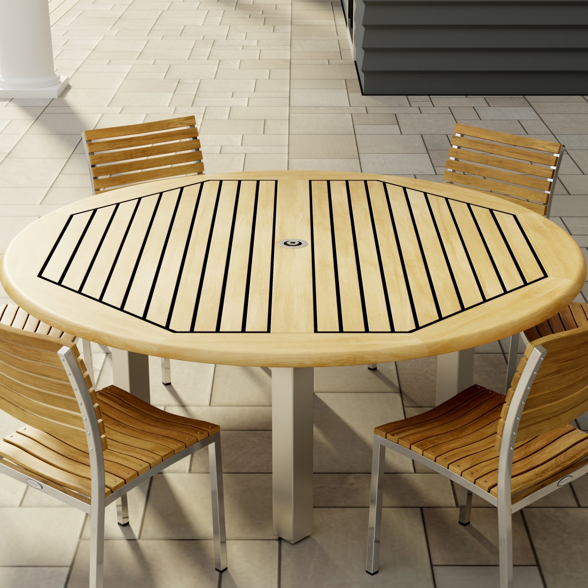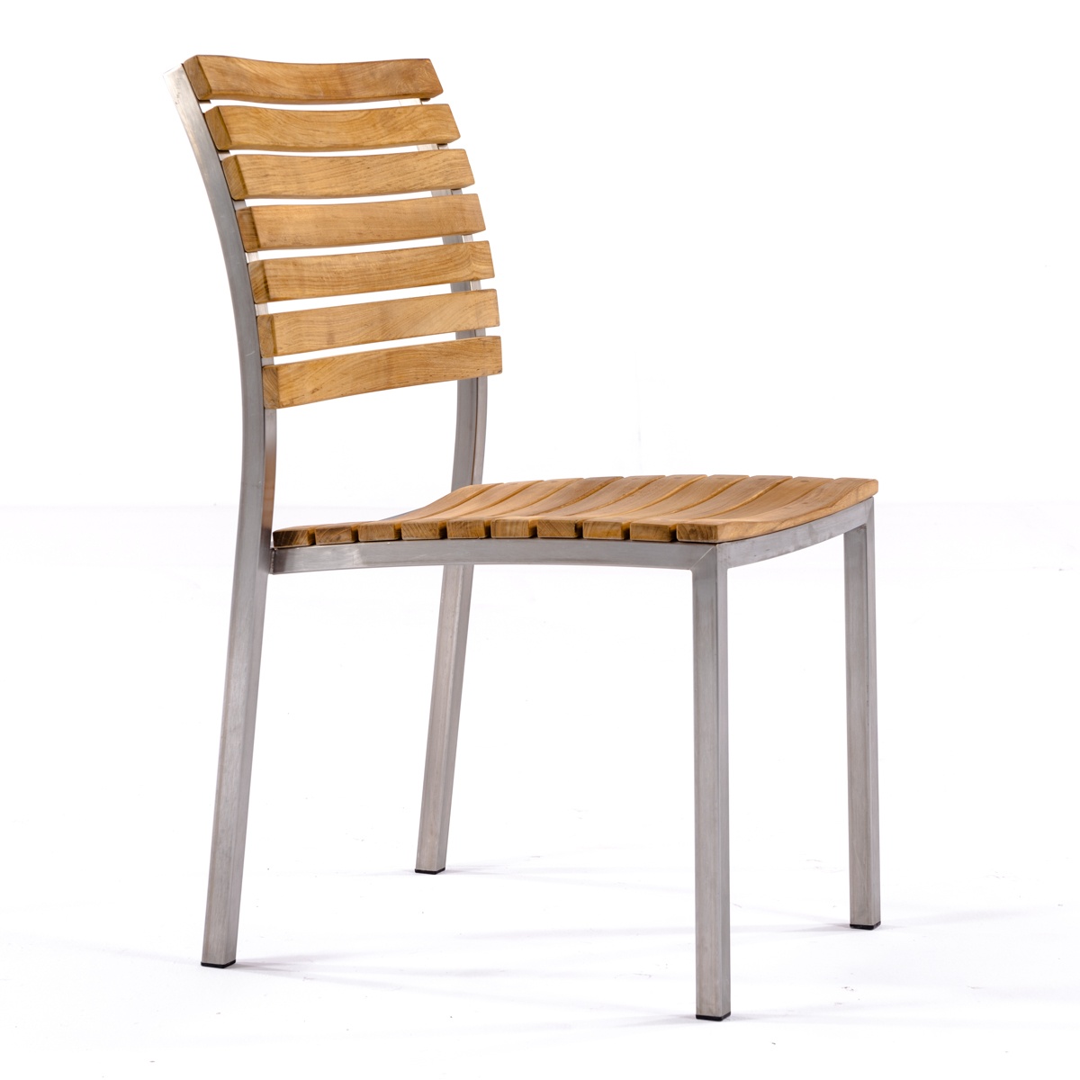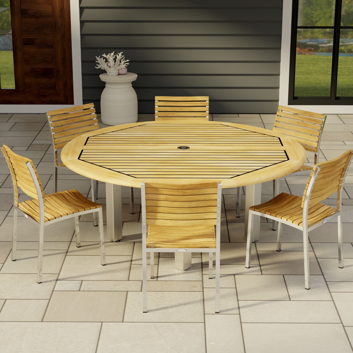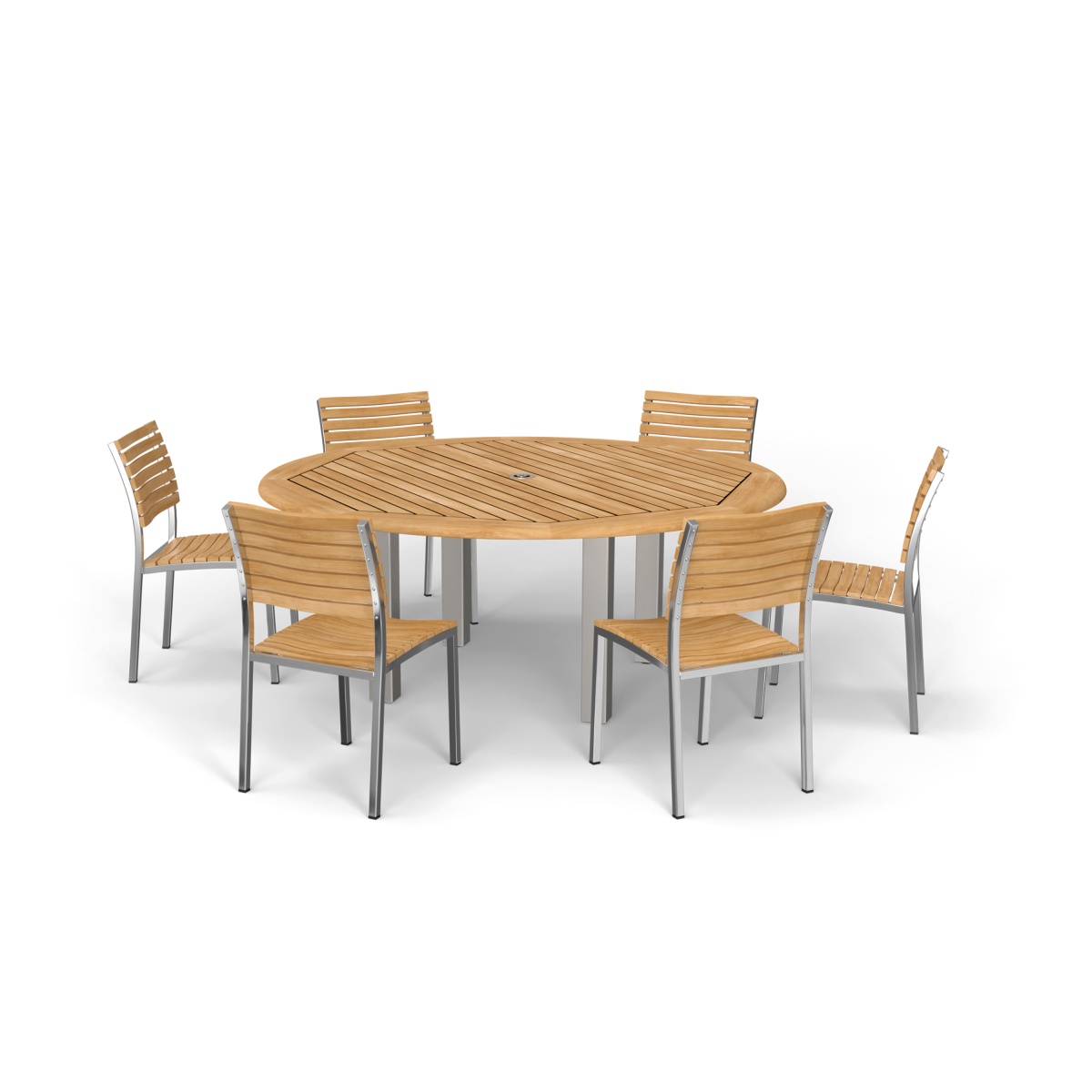The simple elegance of this contemporary set with its interplay of mix materials of solid teak and stainless steel makes this handsomely designed collection an easy choice for outdoor dining. The 6 ft Vogue Tabletop is lined with Sikaflex between slats giving it the practicality and grandeur of nautical style. Slatted teak seats of the chairs are scooped for extra comfort.