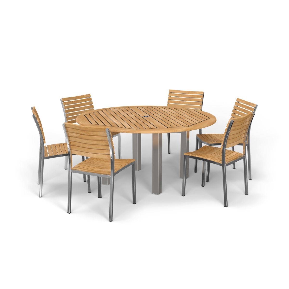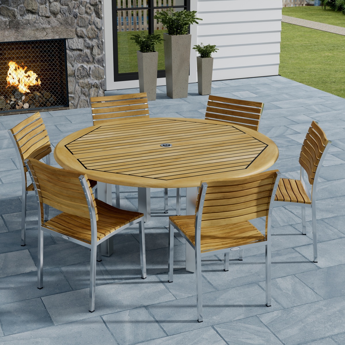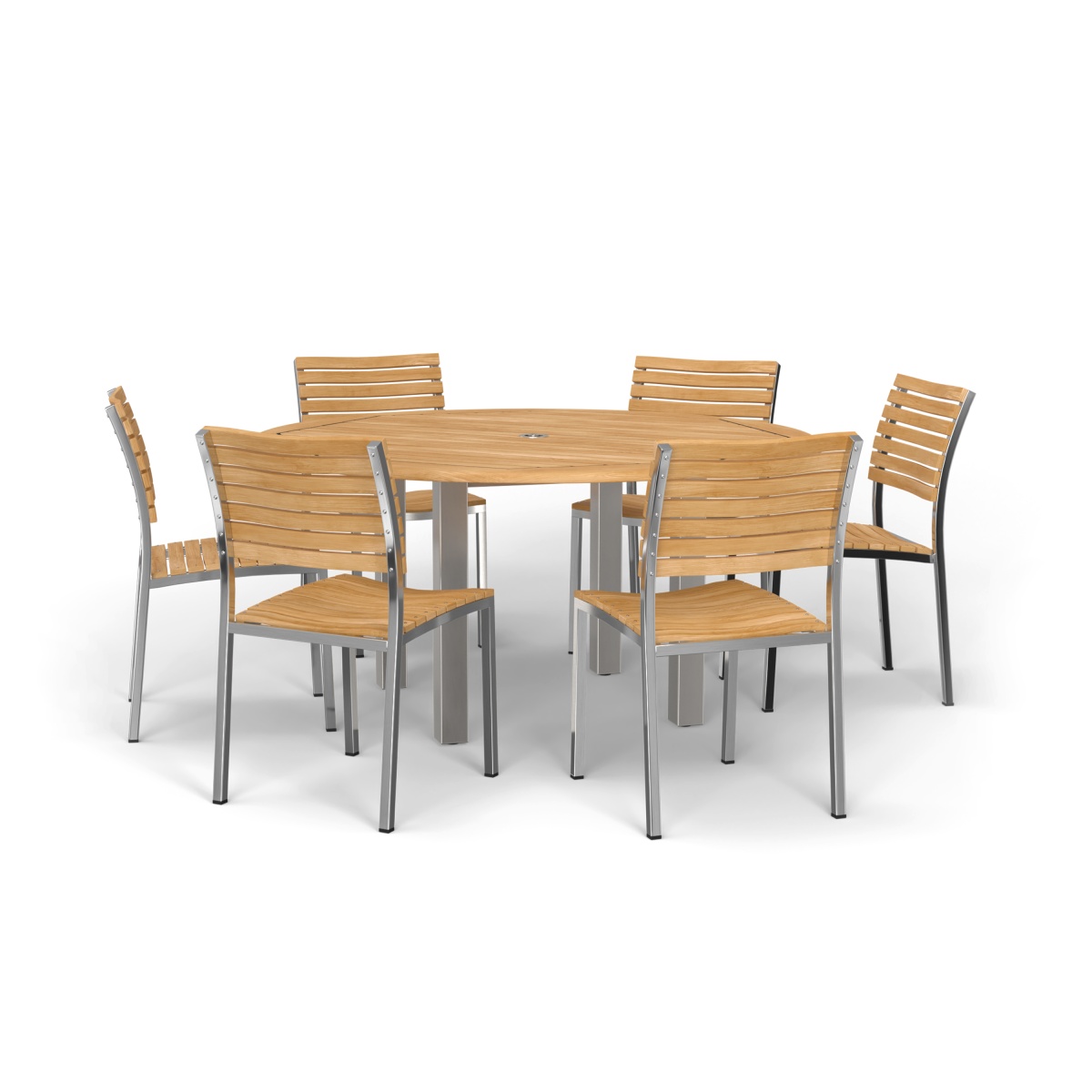 With the interplay of 304 Stainless Steel and Teak Wood, the Vogue Dining Set for 6 defines contemporary dining. The gently curved backrests and seats of the chairs offer lasting comfort even without cushions. The Vogue table's slats are caulked with Sikaflex, a high-grade polyurethane sealant that prevents liquids from seeping through while providing a nautical appeal. Part of the Vogue Collection.