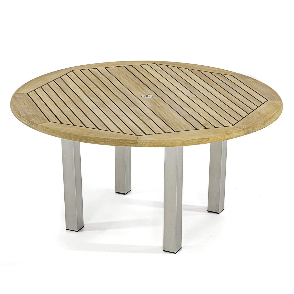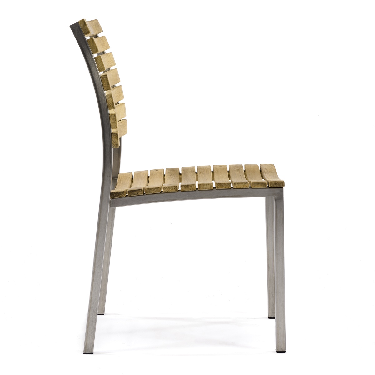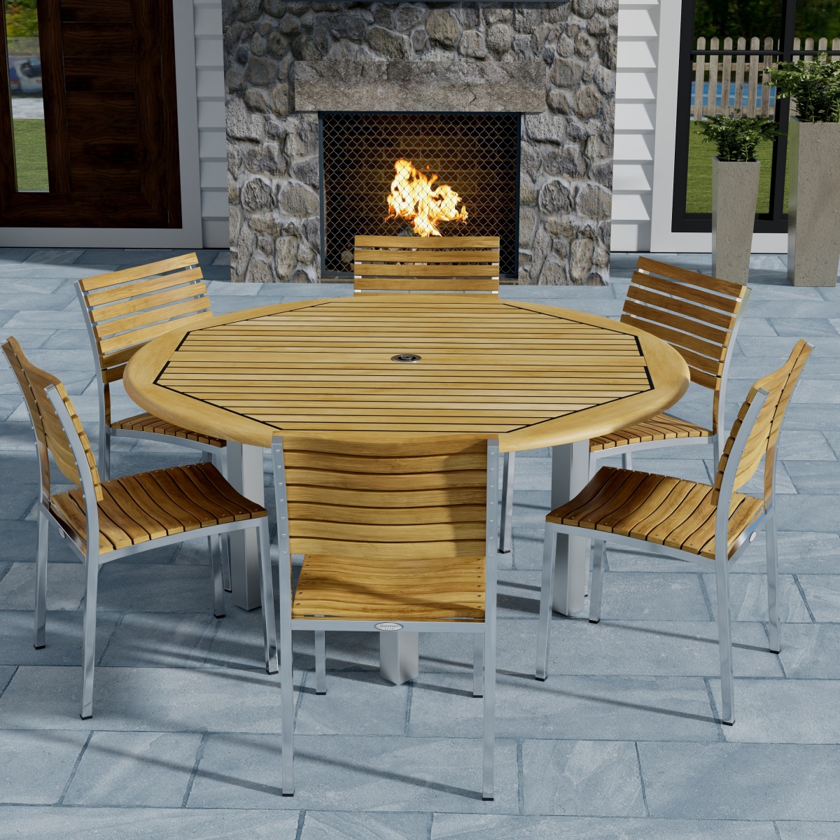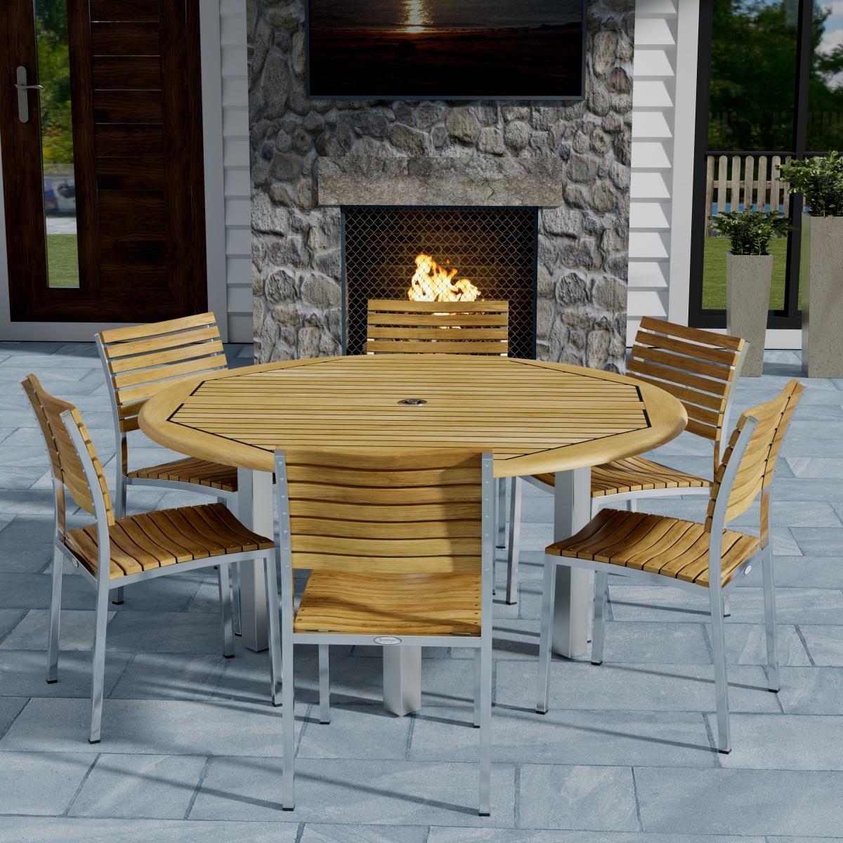 With the interplay of 304 Stainless Steel and Teak Wood, the Vogue Dining Set for 6 defines contemporary dining. The gently curved backrests and seats of the chairs offer lasting comfort even without cushions. The Vogue table's slats are caulked with Sikaflex, a high-grade polyurethane sealant that prevents liquids from seeping through while providing a nautical appeal. Part of the Vogue Collection.