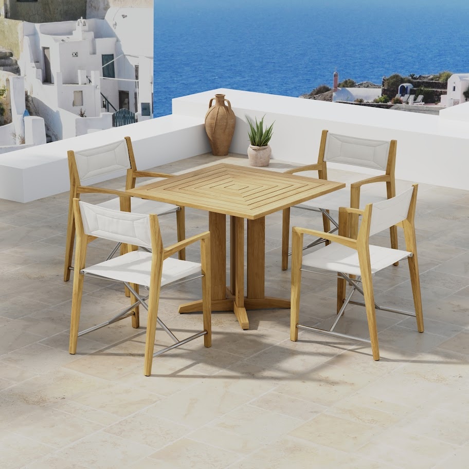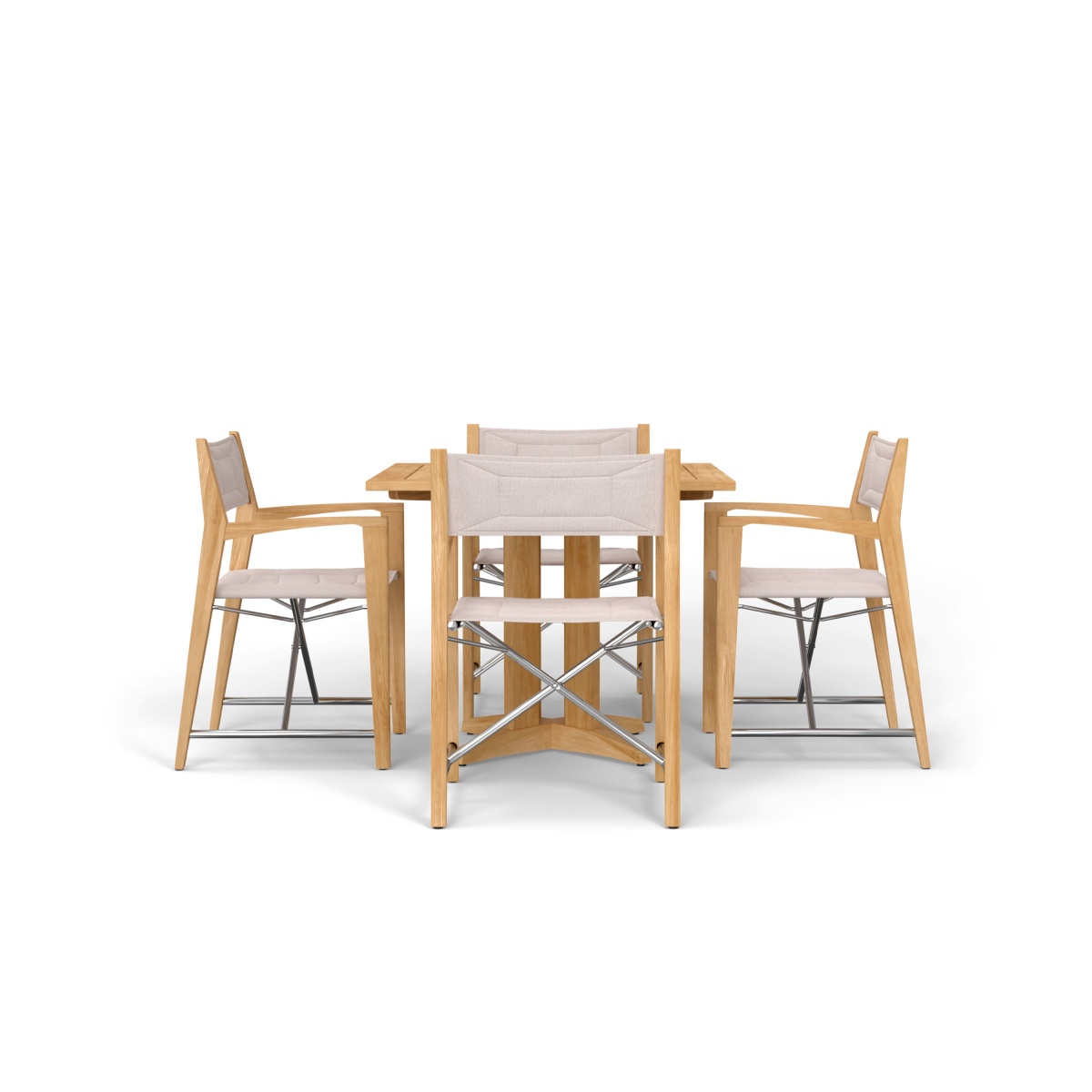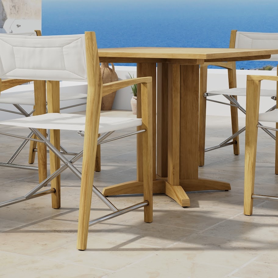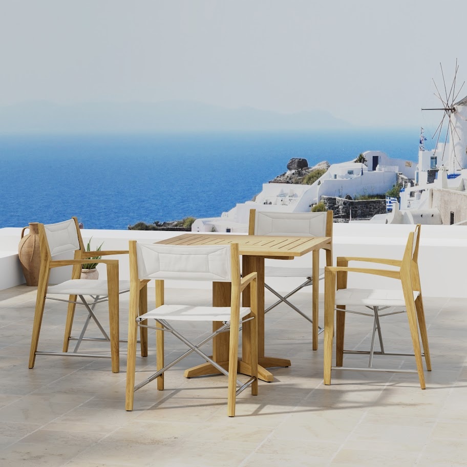 With the geometric beauty of the Pyramid Table and the exceptional comfort of the Odyssey Folding chairs, a reimagination of the classic director's chair, this set has a transitional appeal with elements of traditional craftsmanship and contemporary design. With the Odyssey Chair's nautical lean in the use of 316L Marine Grade Stainless Steel, this set will easily find its home on the deck of a yacht, a seafront home, or the balcony of a high-rise apartment.