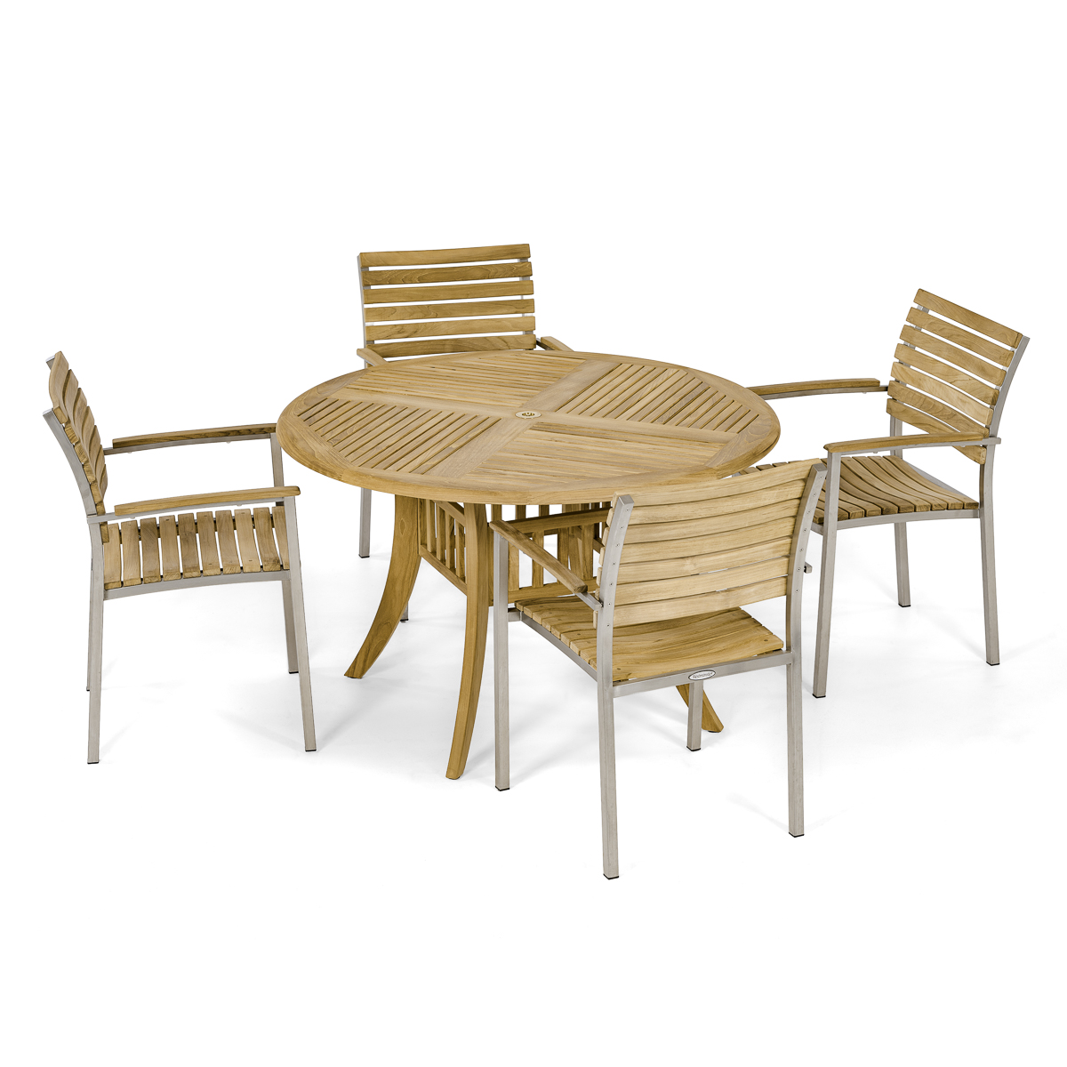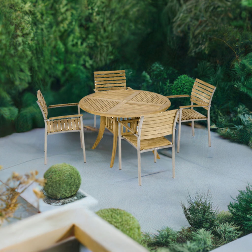 With the interplay of 304 Stainless Steel and Teak Wood, the Round Hyatt Vogue Dining Set for 4 epitomizes the elegance of contemporary dining. The gently curved backrests and seats of the chairs offer lasting comfort while complementing the 4 ft diameter Grand Hyatt round teak table which features a unique and distinct Block Leg Design (BLS) for style and elegance. Westminster Teak Outdoor Tables have a life expectancy of 75 years, untreated and weathered.