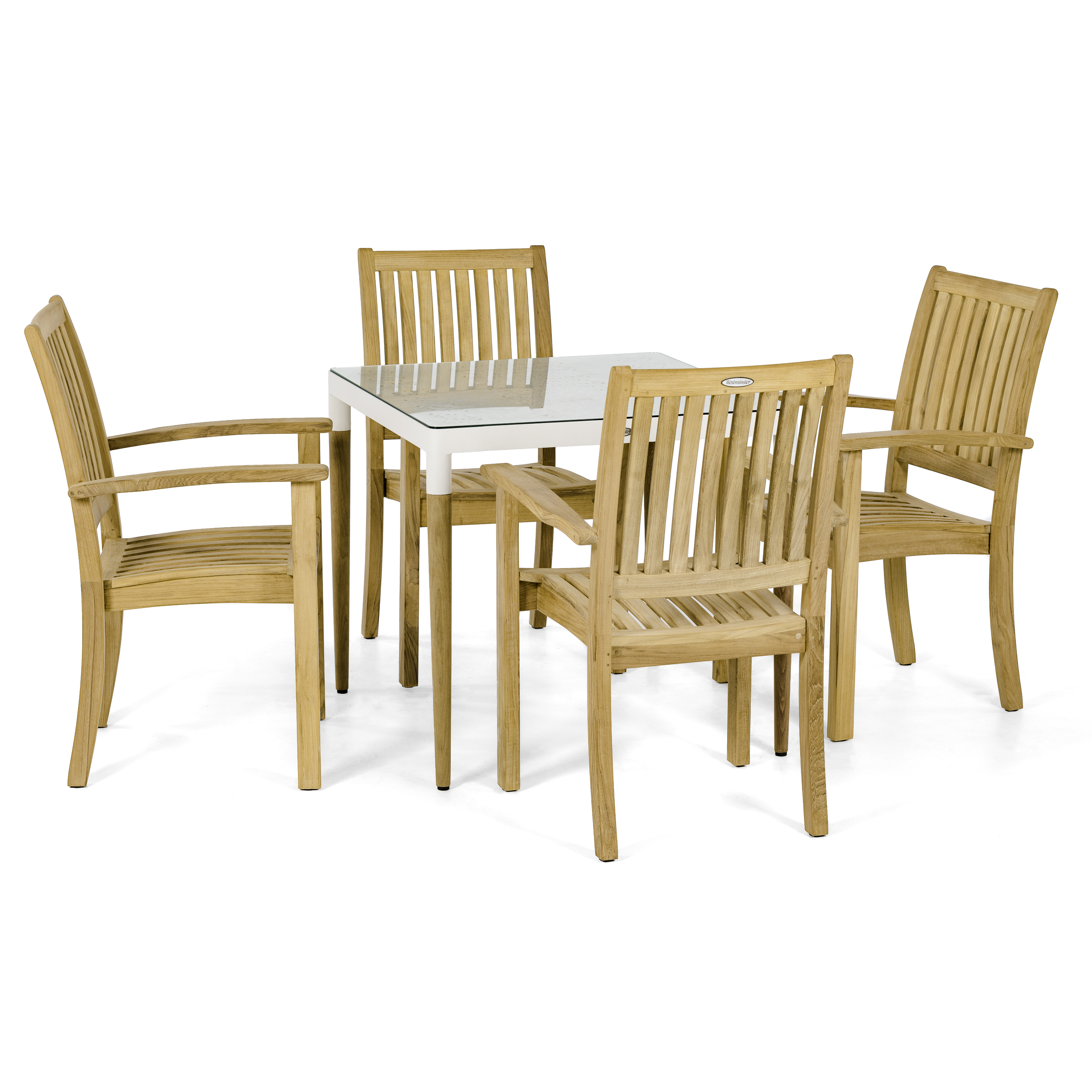 Pairing traditional and contemporary designs, the Bloom Sussex 5 piece set is defined by the stunning contrasts of refreshing white powder coated aluminum and the warmth of micro-smooth teak. The ergonomic design in the backrest and seat of the Sussex Stacking Chairs offers lasting comfort and can be stacked for easy storage. The aluminum bloom design in the table, precision cut with the latest water-jet technology, casts lively shadows of spring flowers under the sun. With the impeccable strength of two classic outdoor materials, all pieces endure the test of time and the outdoors.