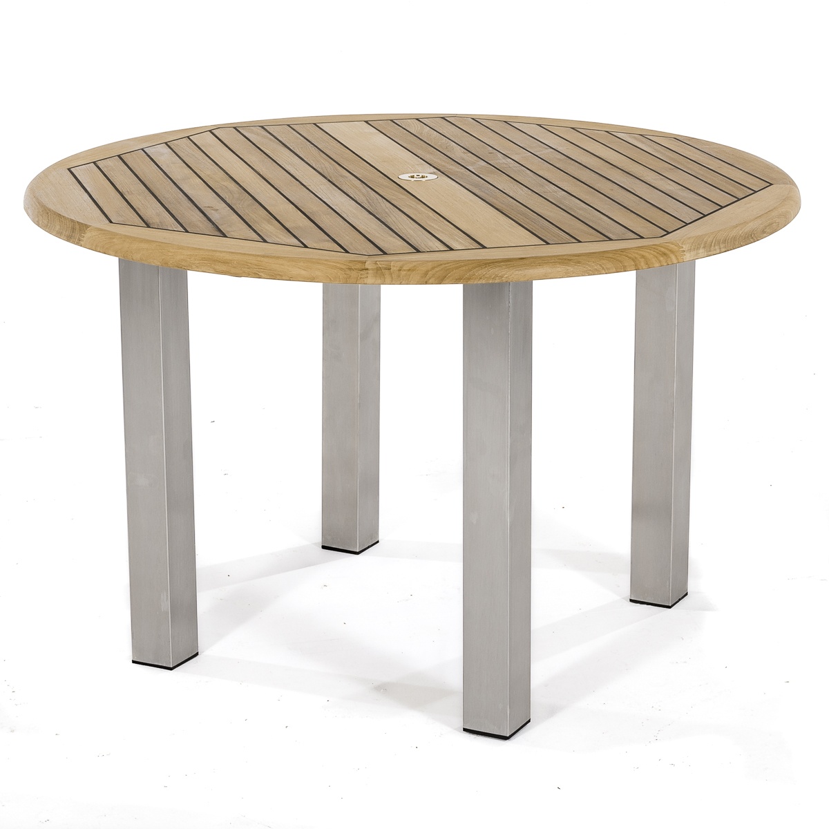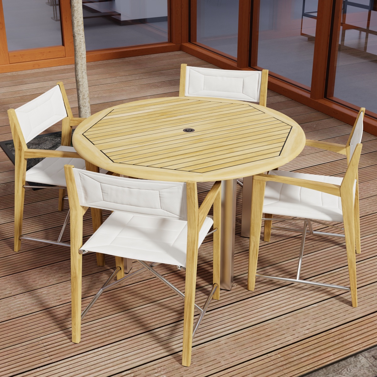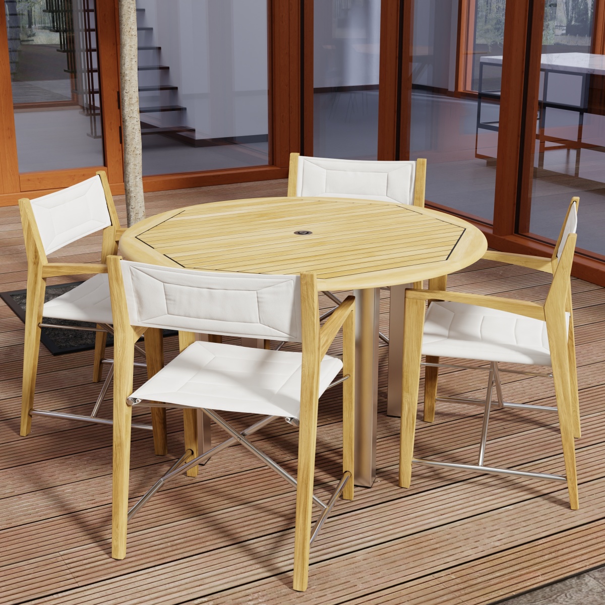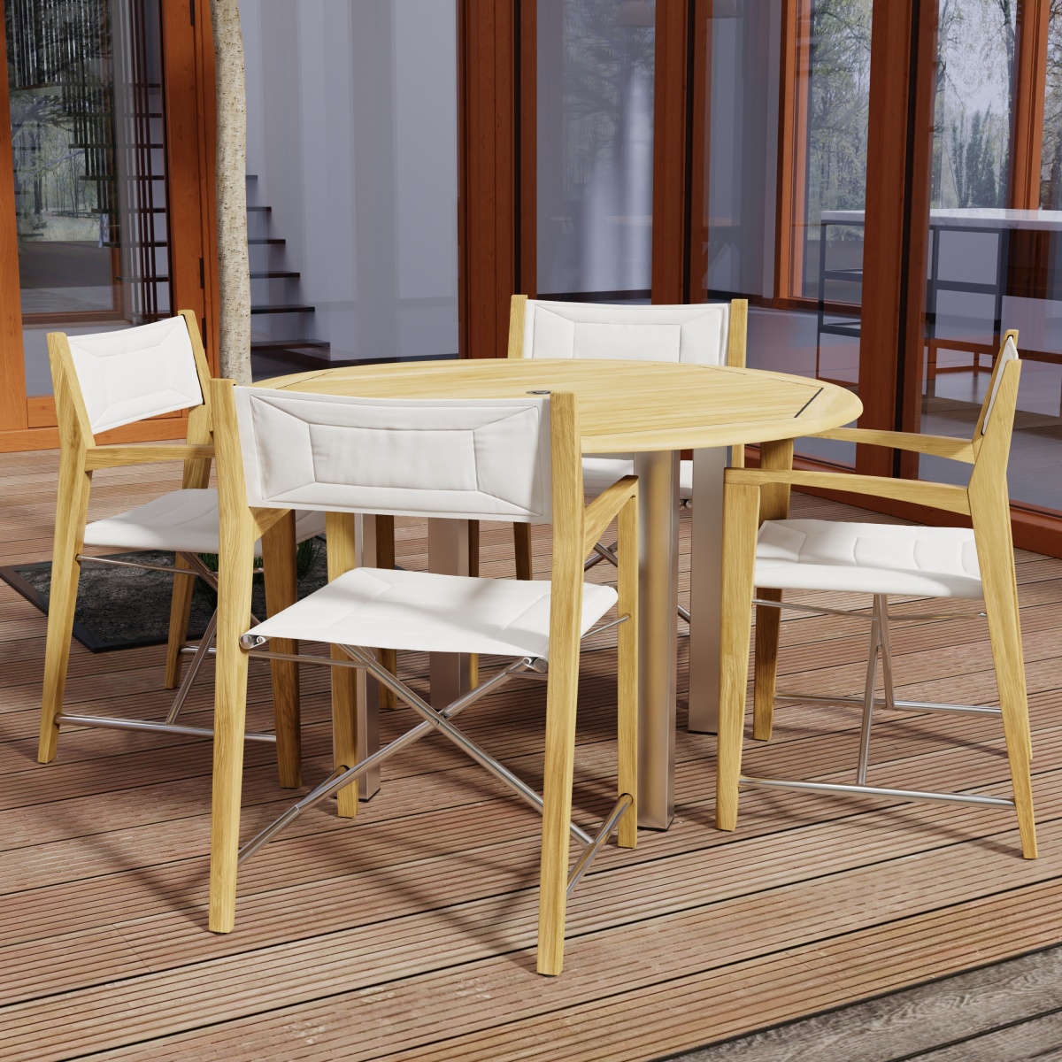 Pairing traditional and contemporary designs, the Vogue Odyssey 5 piece set is defined by the stunning contrasts of refreshing stainless steel and the warmth of micro-smooth teak. The ergonomic design in the backrest and seat of the Odyssey folding Chairs offers lasting comfort and can be folded for easy storage. The teak and stainless steel in the Vogue Round Table combines impeccable strength of two classic outdoor materials, all pieces endure the test of time and the outdoors.