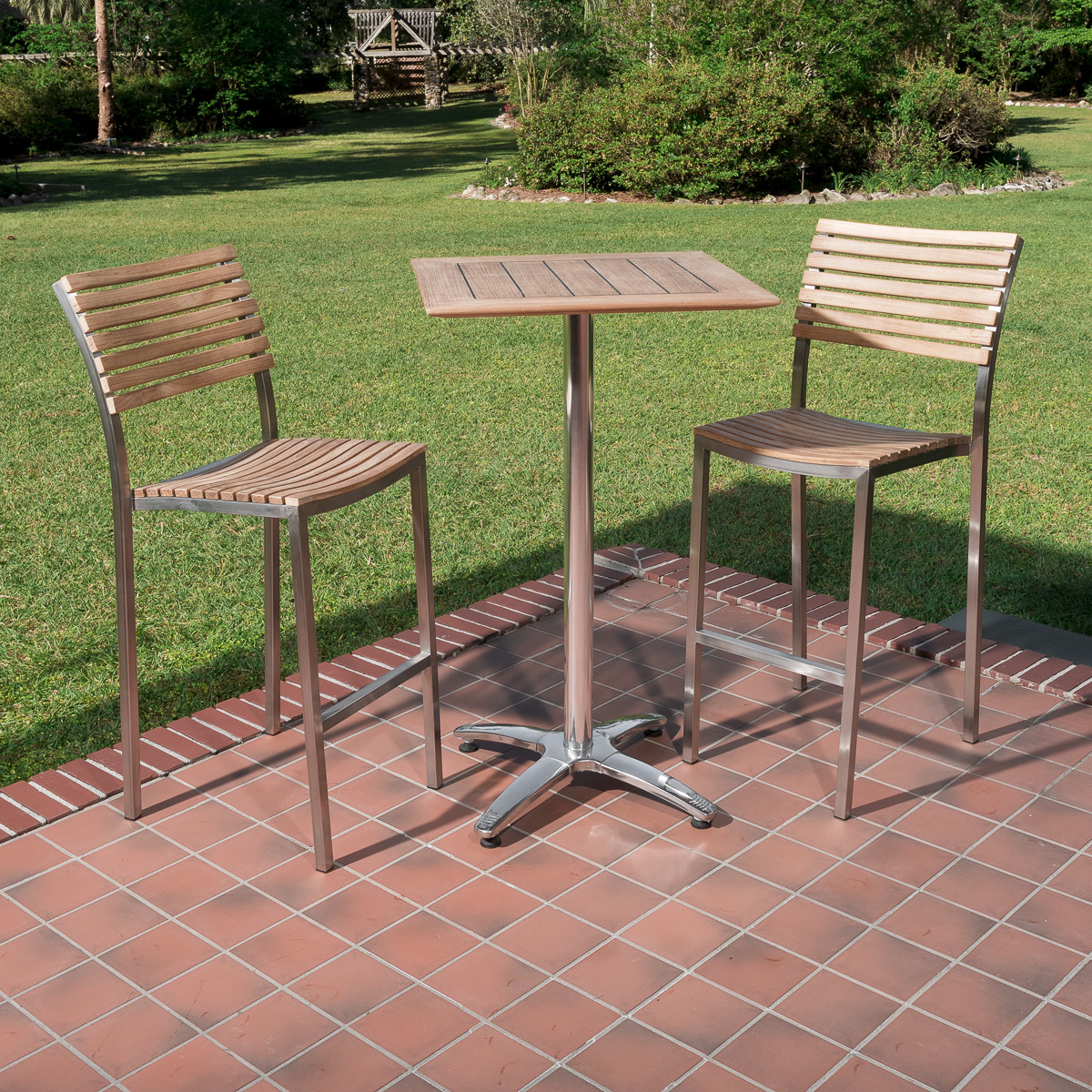 With the transitional appeal of Stainless and Teak, the Vogue Square Bar Set for 2 fits well in any setting. The Vogue Side Bar Stools offer lasting comfort with their gently contoured backrests and seats while complementing the Vogue 24 x 24 Table Top and Gar Stainless Steel Base, achieving a simple yet harmonious balance.