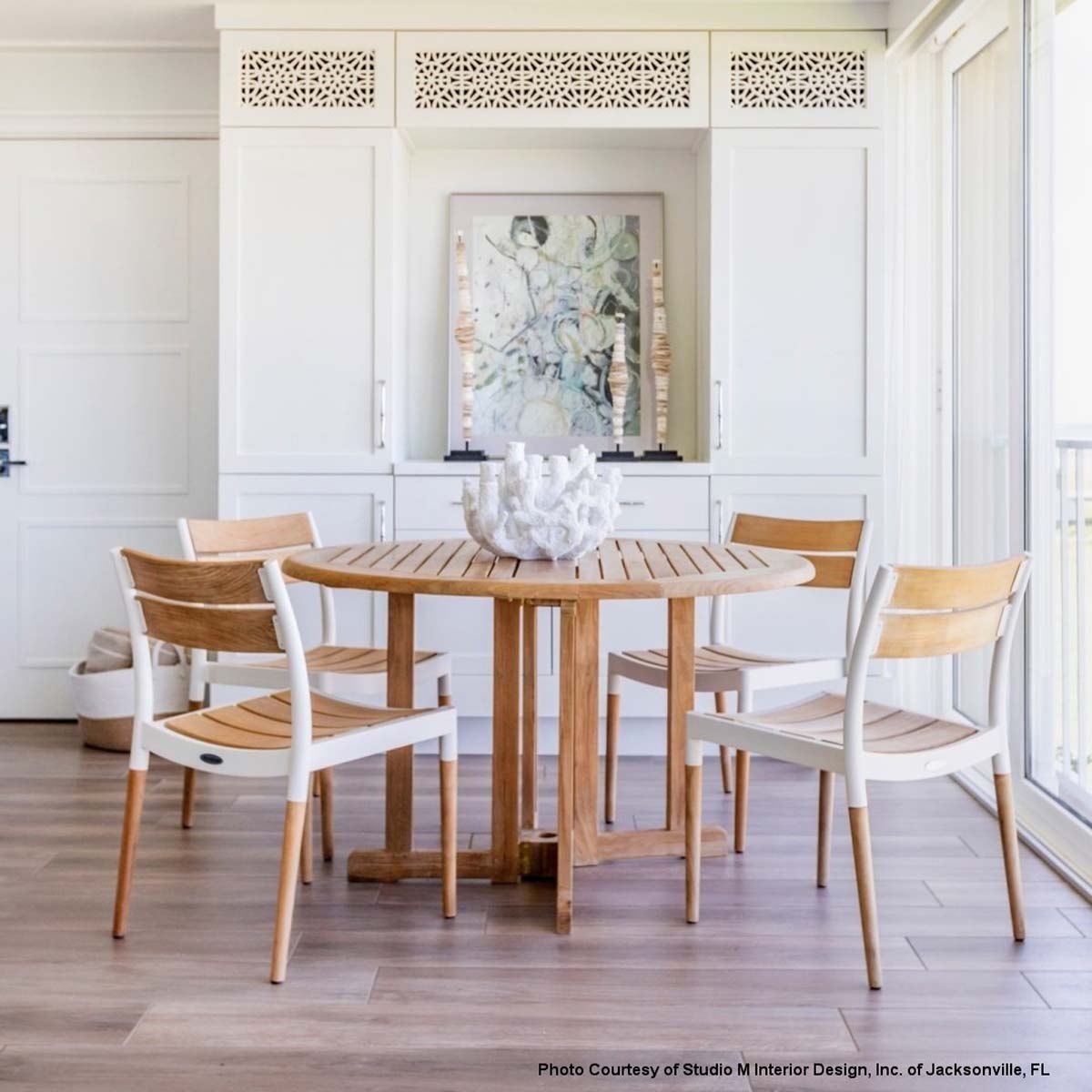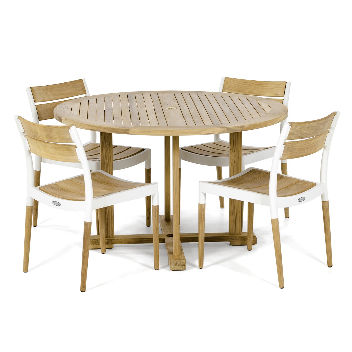 Bloom Side Chair-Powder Coated Aluminum & Teak: Glides 4ft Round Teak Dining Table: Large Levelers |