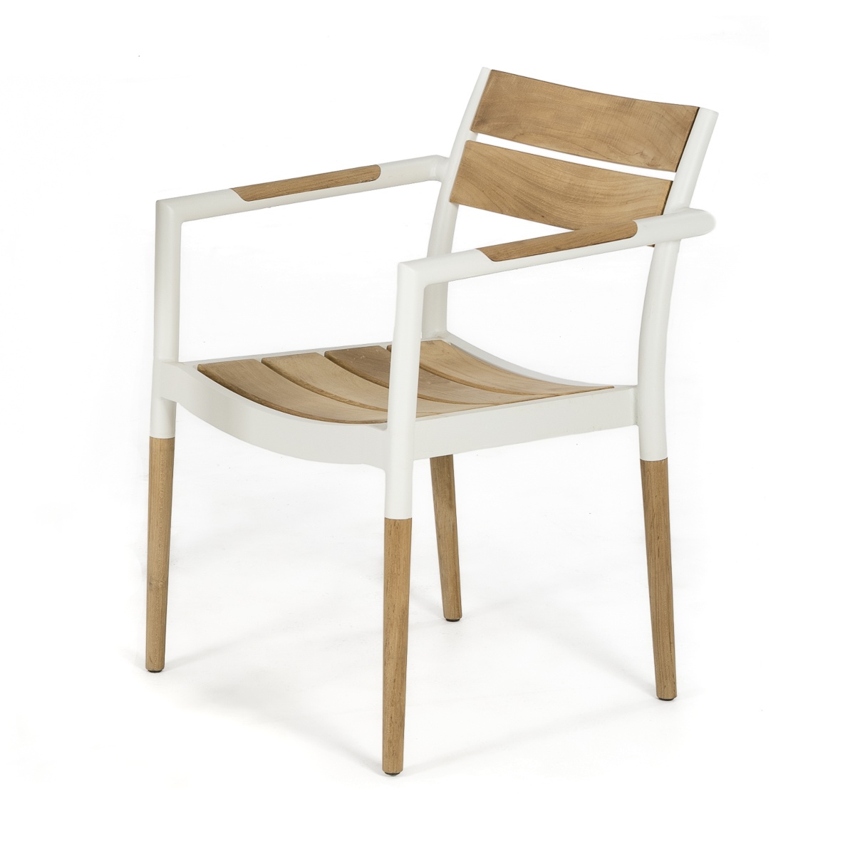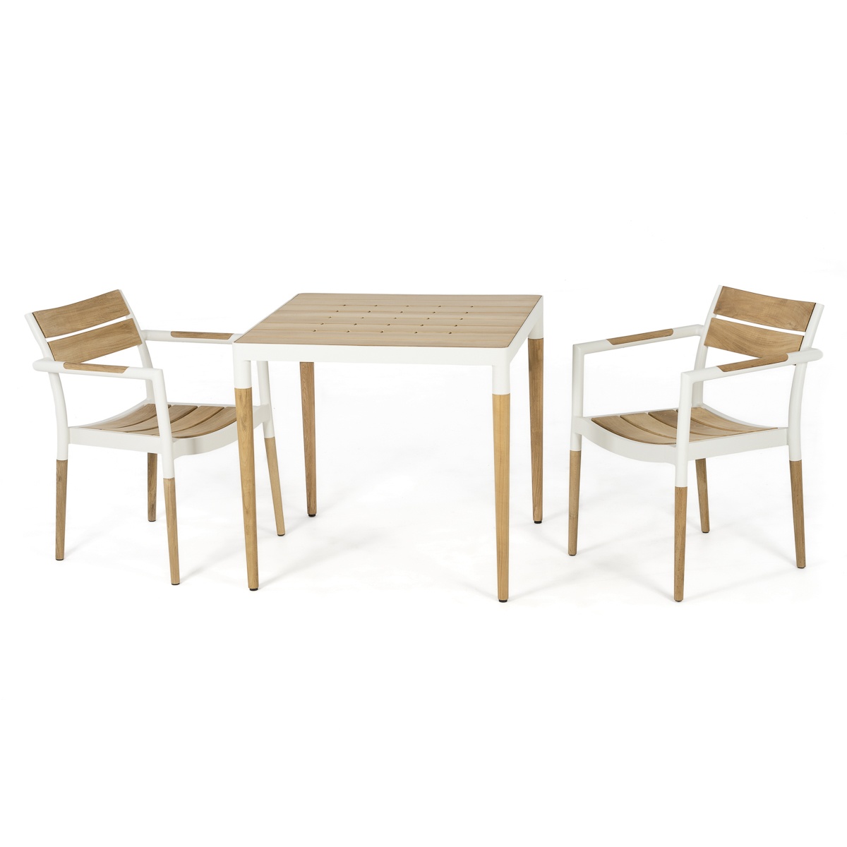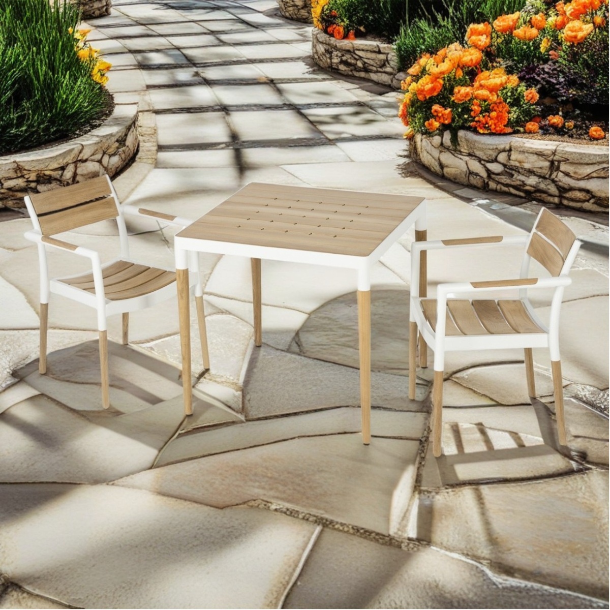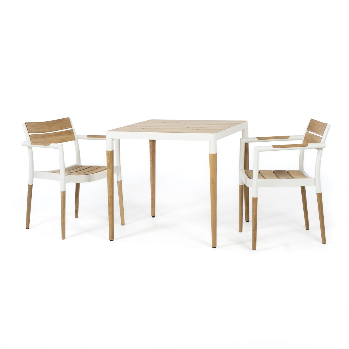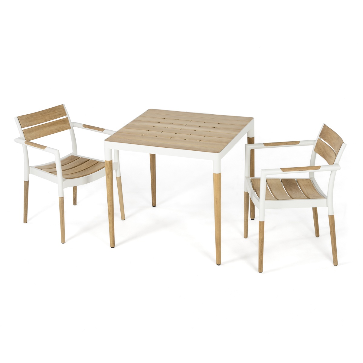 Defined by the stunning contrasts of refreshing white powder coated aluminum and the warmth of micro-smooth teak, this Bloom Bistro Set emanates a chic sense of style. The contoured backrests and scooped seats of the chairs offer lasting comfort even without cushions. The teak inset into the aluminum armrests keeps the skin cool in the summer, and warm in the colder seasons. Part of the Bloom Collection.