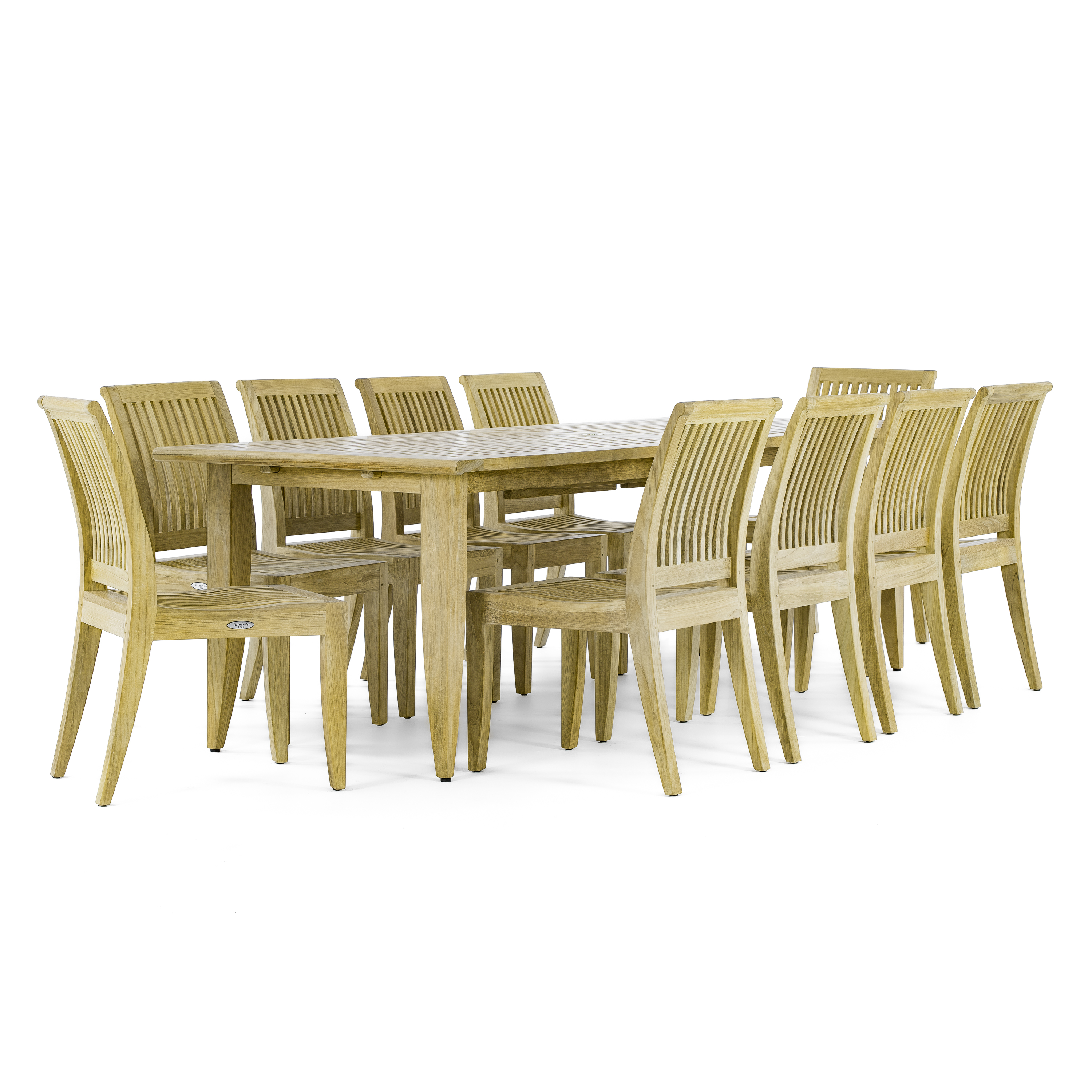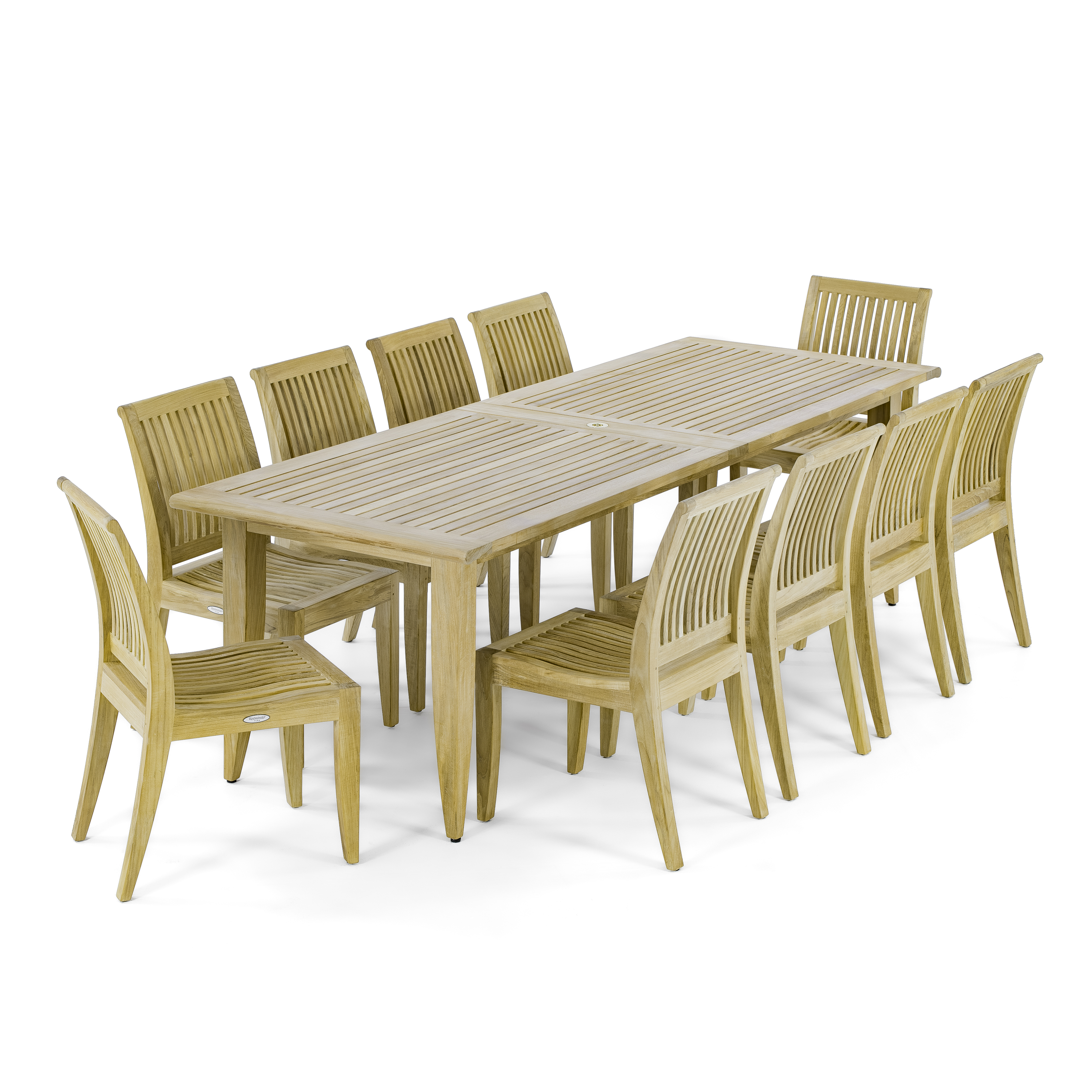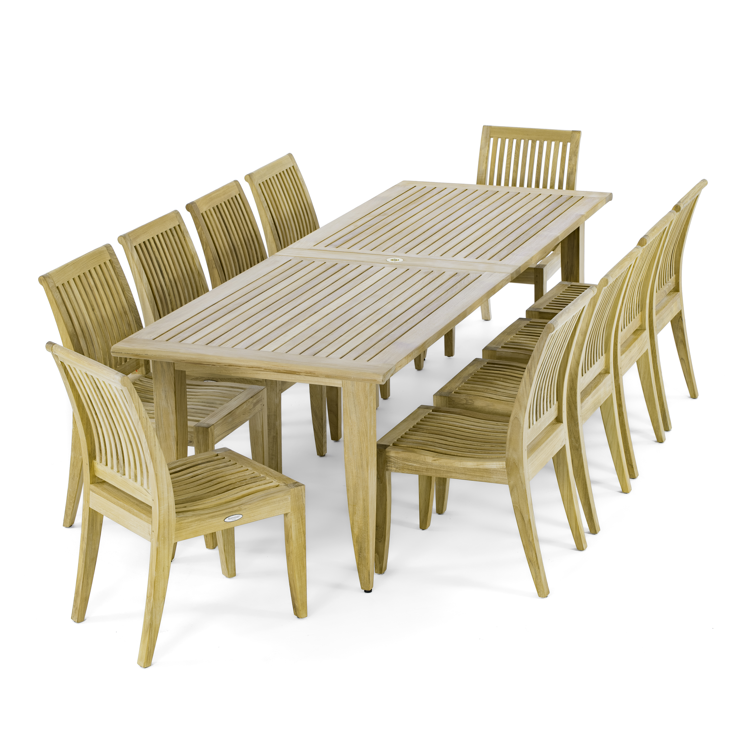 The elegant and classic 11 Piece Laguna Dining Set is designed as a 14 person dining table that could easily convert to 8 or 14 with timeless quality in mind. Including our largest outdoor table, the Grand Laguna Extension Table, and Laguna Side chairs, this set will become the center of any family gathering from holiday meals or dinner parties. An optional umbrella, Sunbrella Cushions, Teak Floor Tiles and Lazy Susan are available for this set.