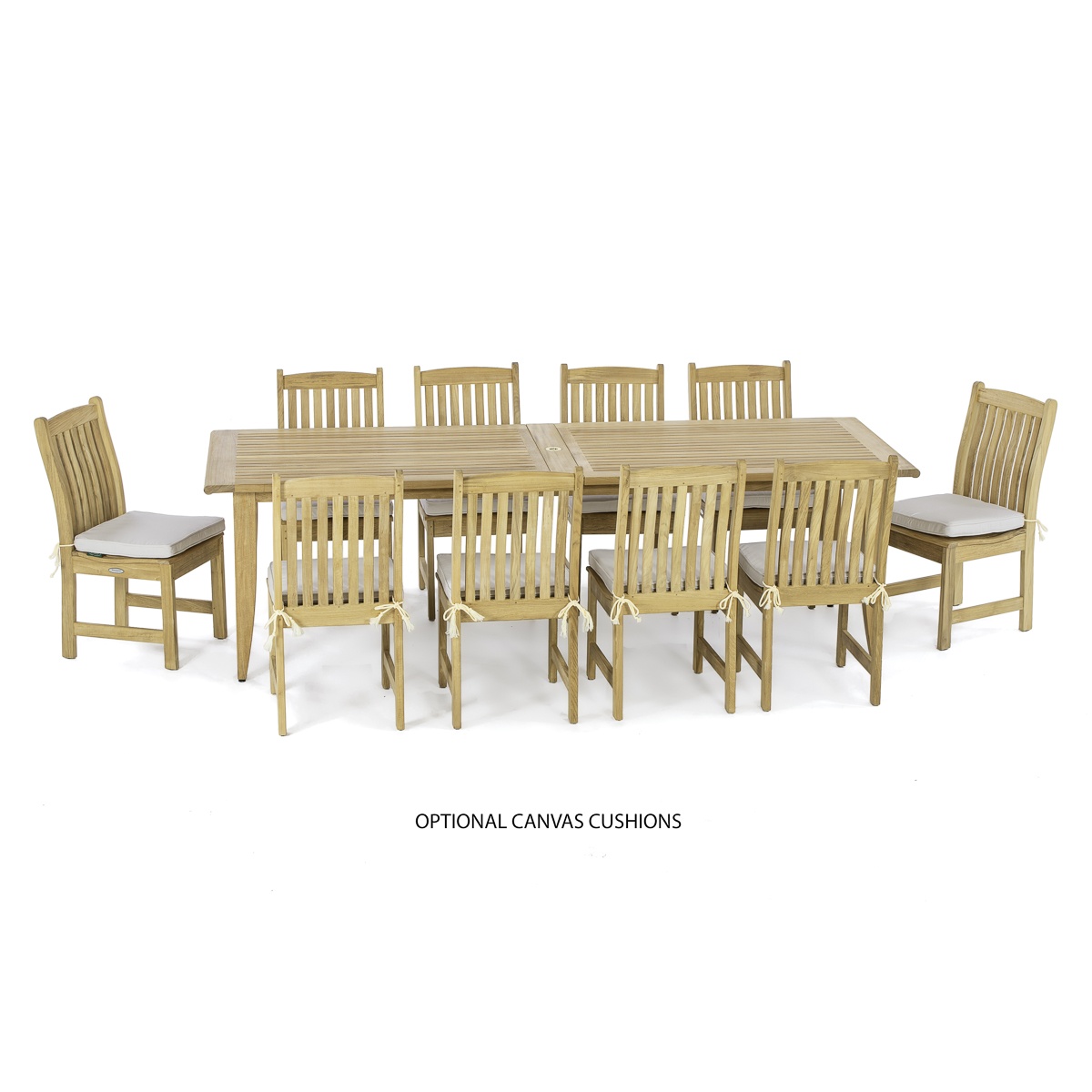 The elegant and classic 11 Piece Laguna Veranda Dining Set is designed as a 12 to 14 person dining table that could easily convert to 8 or 10 with timeless quality in mind. Including our largest outdoor table, the Laguna Grand Table, and Veranda dining chairs, this set will become the center of any family gathering from holiday meals or dinner parties. An optional umbrella, Sunbrella Cushions, Teak Floor Tiles and Lazy Susan are available for this set.
