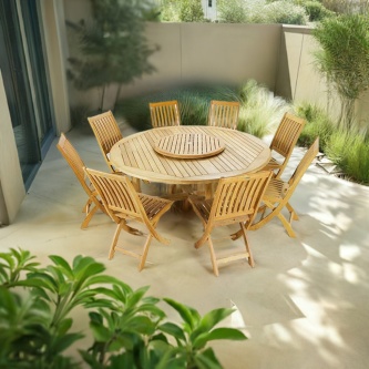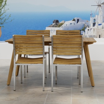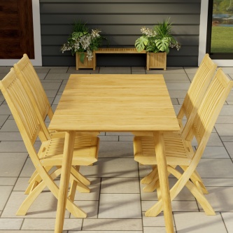 Teak Dining Sets Containing Teak Side Chairs only. All of our teak table and chair sets come with a lifetime warranty and are constructed of 100% Grade A, Eco-Friendly teak wood from renewable plantations. Our SVLK Certified teak wood does not require any type of oil, treatment, sealant or waterproofing to remain outdoors, exposed, year round, in any climate.