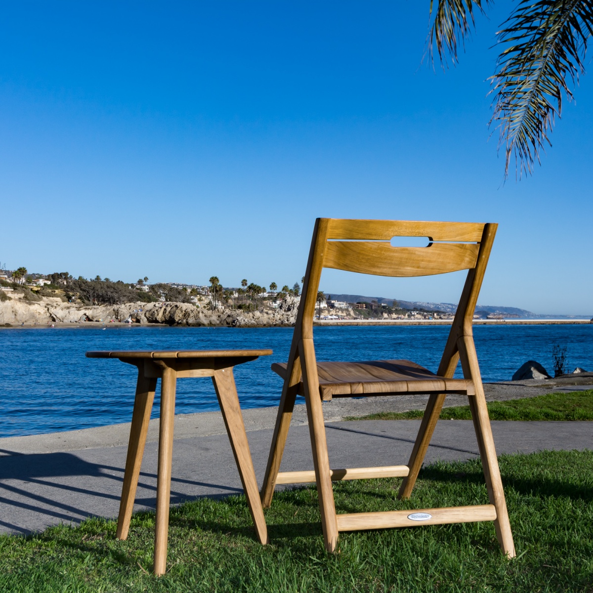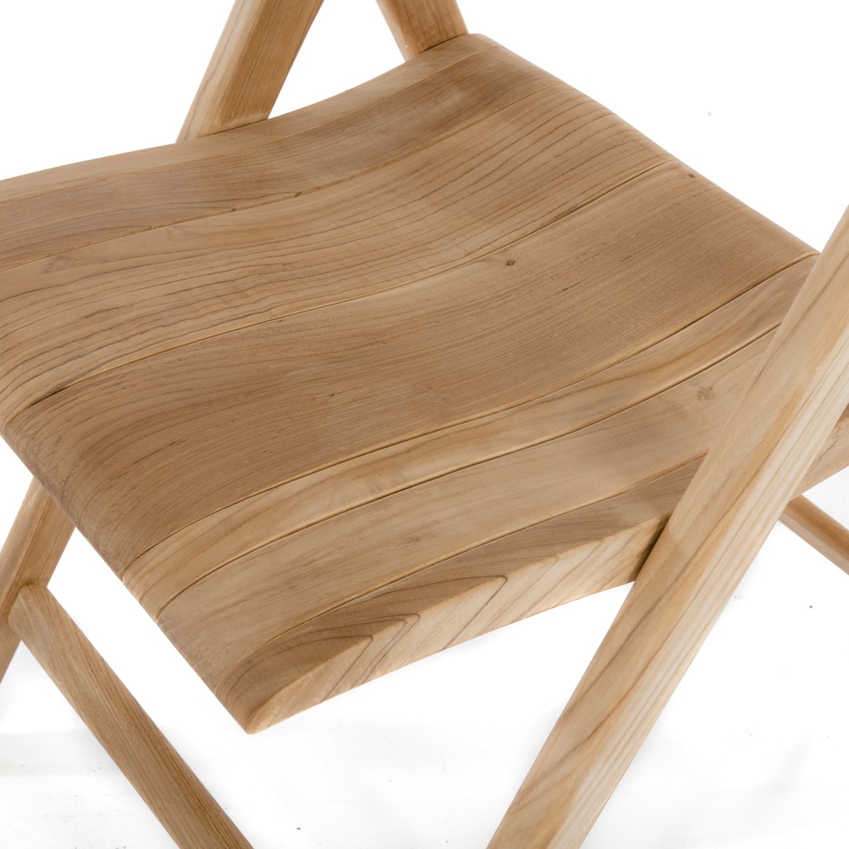Clean lines, welcoming curves, and the organic feel to the touch of its smooth rounded edges give the Surf Folding Chair its immediate appeal. First impressions hardly reveal that the exceptionally comfortable chair folds effortlessly. Though visually robust and generously scaled, it is relatively lightweight yet structurally strong given its solid teak stature, allowing this chair to endure the test of time and the outdoors. With a graceful stance and statuesque silhouette, the Surf folding chair will fit beautifully anywhere: on a super yacht, at a dining table, on a sun-drenched terrace, or extra seating when needed... wherever, whenever.
