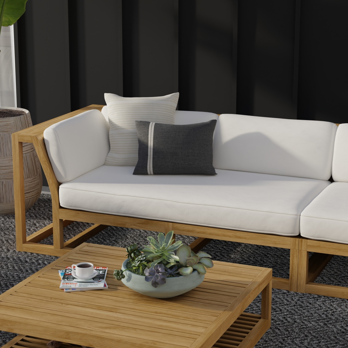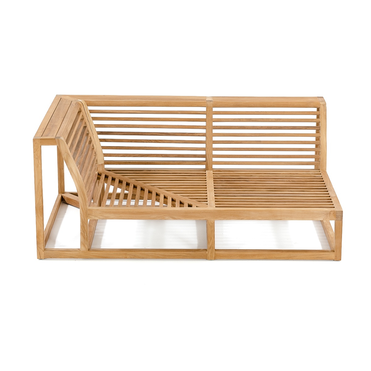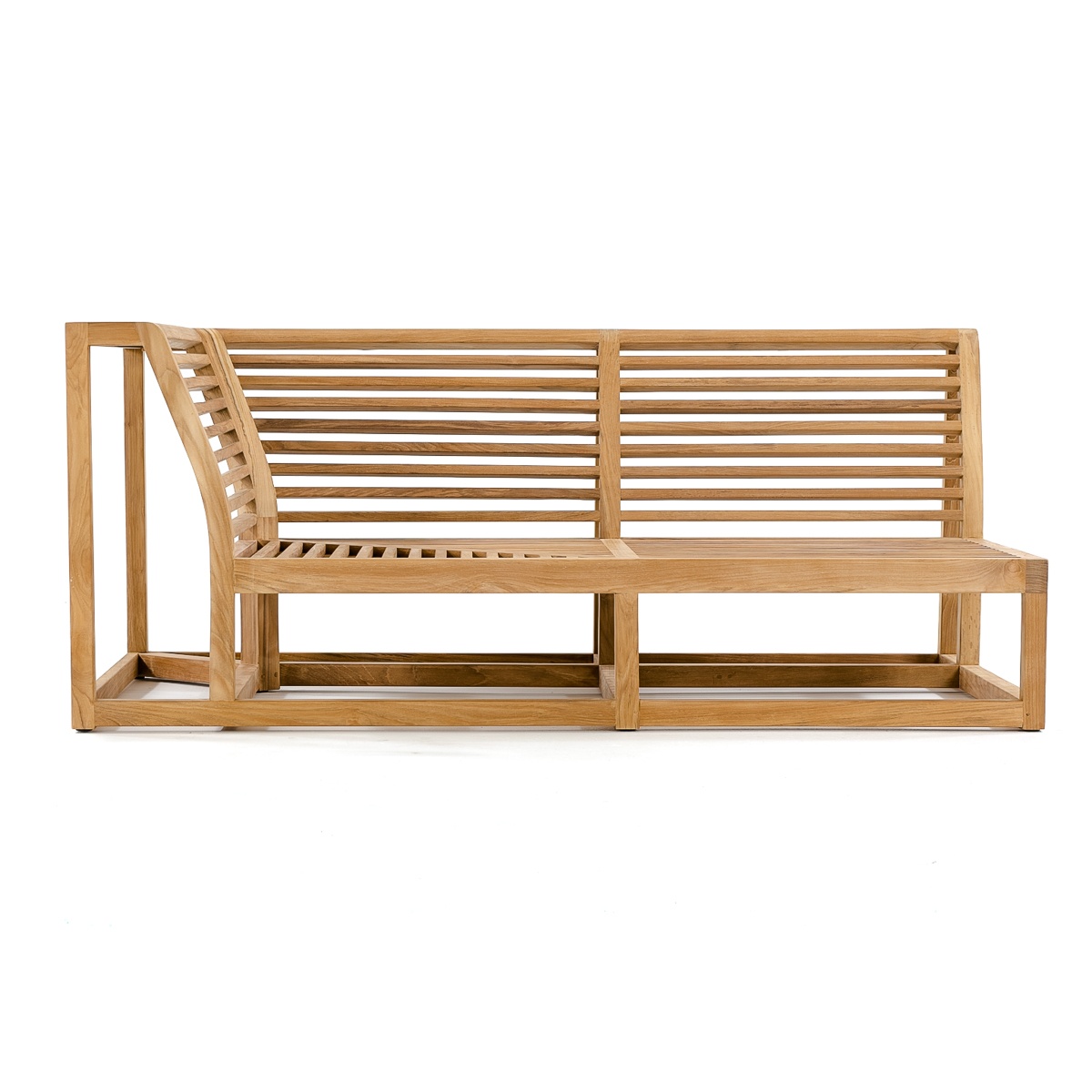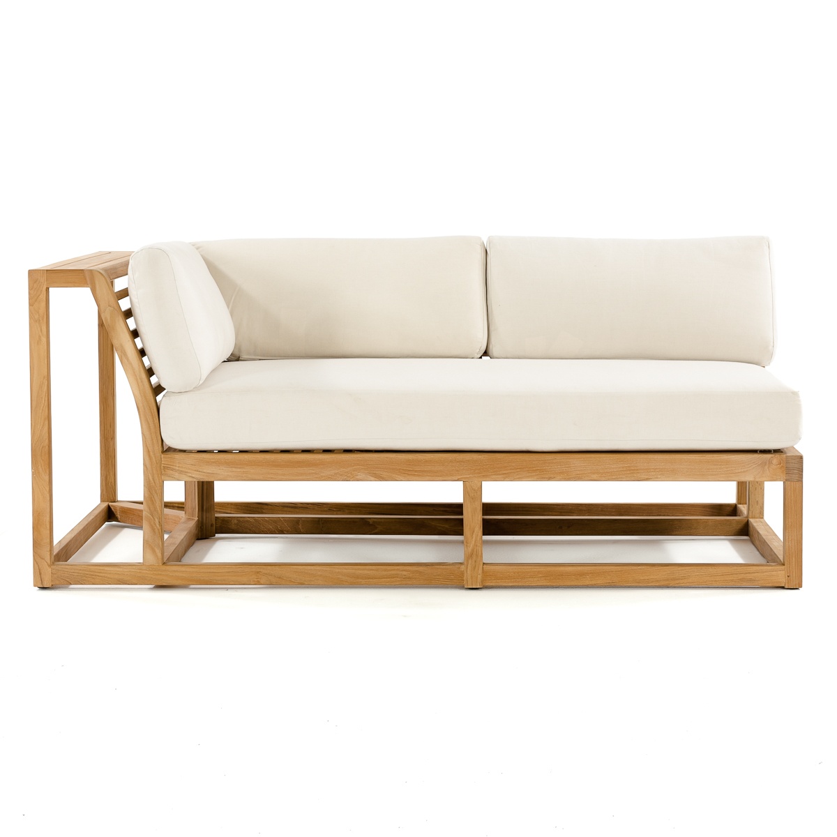Plush, deep cushions atop a clean-lined solid teak frame give the visual impression of lightness while 6" wrap-around armrests provide ample space for drinks, yet are sturdy enough to sit on. The Maya Right Sectional can be used in a number of combinations with the other pieces in the Maya collection to fit any space. Pair with a Maya Teak Corner Sectional or the Maya Left Teak Sectional to make unique and arrangeable sofas. Combine with more pieces from the Maya Collection to make your own daybed oasis--the possibilities are endless, and it is sure to be the center of any social gathering or peaceful relaxation.
