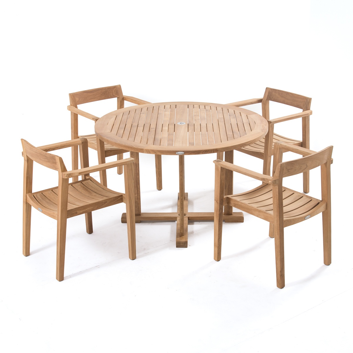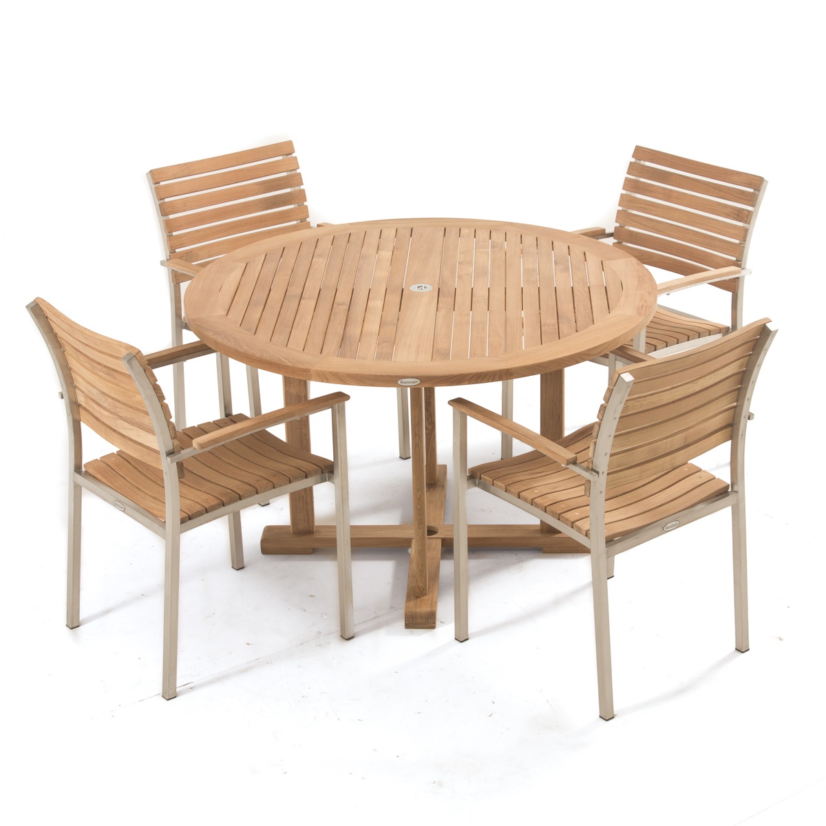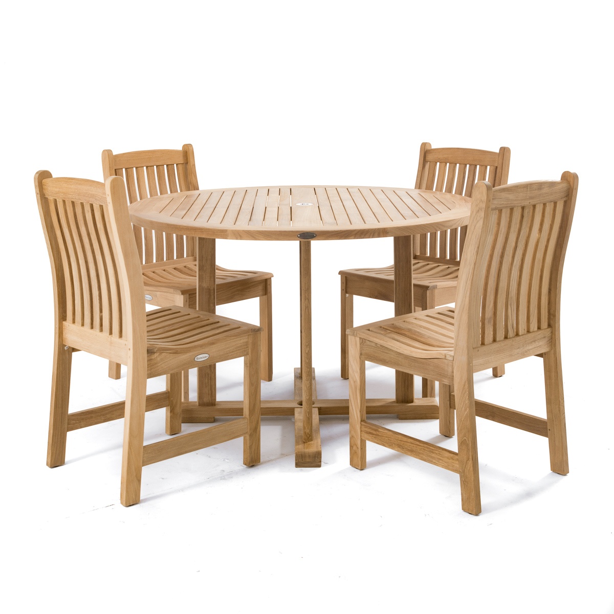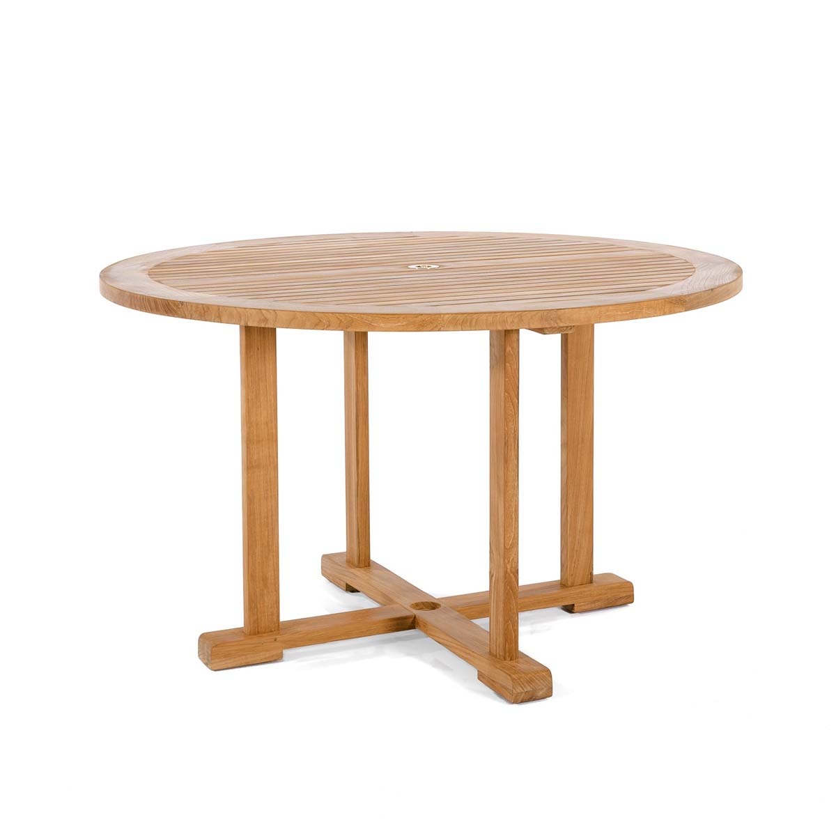 This highly functional 48” teak round table seats up to four, and can be paired with any of our chairs, including sling and wicker. Whether used as a dining table on an outdoor patio, in the garden, or at a luxury resort, this round table will define any space and complement any style. For outdoor use, it is designed with a hole for our teak umbrella.