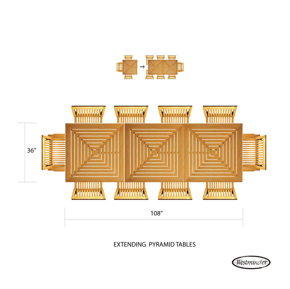 The Pyramid Table Collection draws its beauty from its geometric lines. The tabletop’s reducing square design coupled with classic forms in its leg bases gives the collection its name. The Pyramid’s narrow width encourages more intimate dining while its pedestal style legs allow for uninterrupted legroom. Multiple Pyramid Square or Rectangular Tables can be used to extend this 36 in. table into various arrangements for versatile dining sets, which can accommodate just about any of our dining chairs.