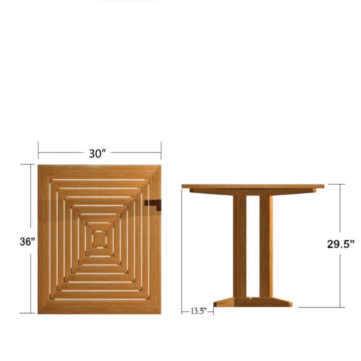 36" L x 30" W x 29.8" H Ground to Table Apron - 27.2" Legs to the Edge of Table Top - 13.5" Table Top Thickness - 1" "30103 Teak Shield recommended to protect against stains" |